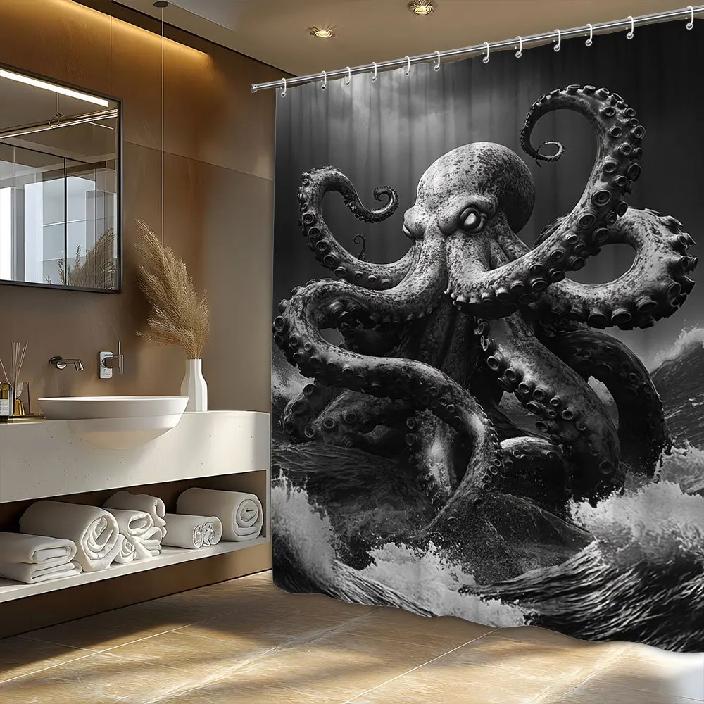 Tenda da doccia con polpo terribile in bianco e nero, decorazione per il bagno fantasy, con 12 ganci, tenda da doccia 1Tenda da doccia con polpo terribile in bianco e nero, decorazione per il bagno fantasy, con 12 ganci, tenda da doccia
