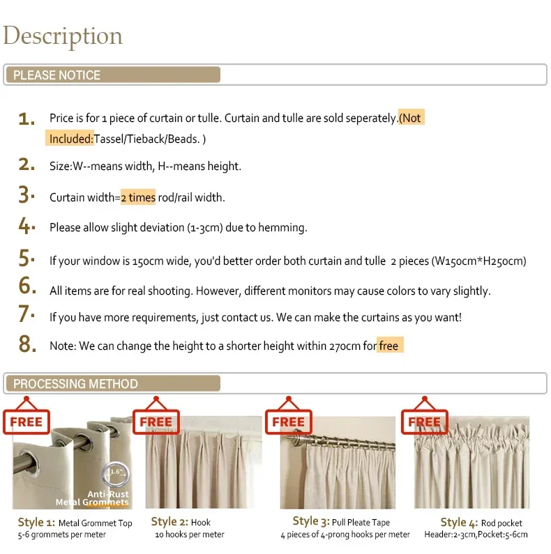 | Package included | 1 piece Cloth Curtain or 1 piece Tulle |