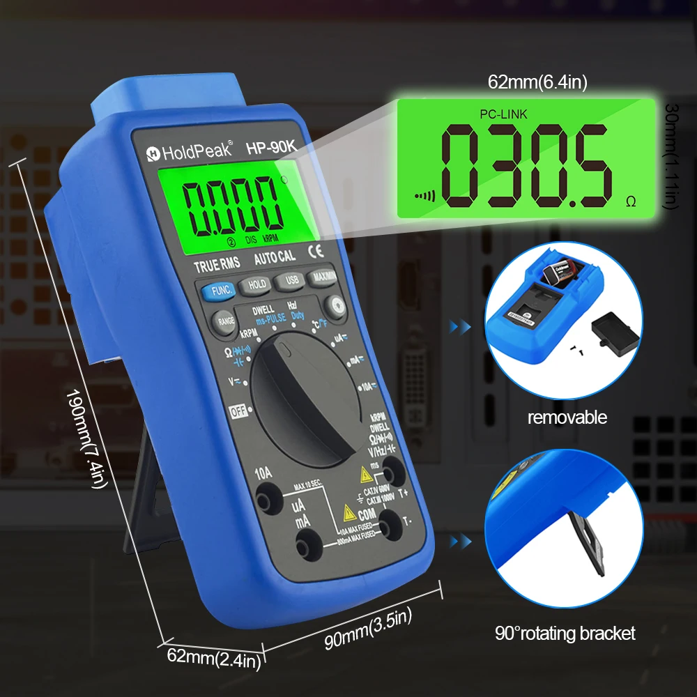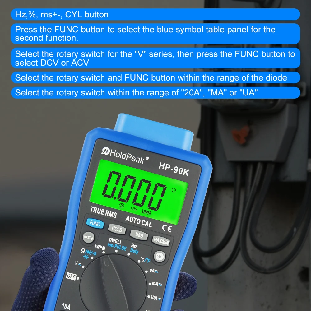 Strumento diagnostico per auto con range automatico del tester dell’analizzatore motore HoldPeak HP-90K con uscita dati tramite multimetro USB per autoveicoli