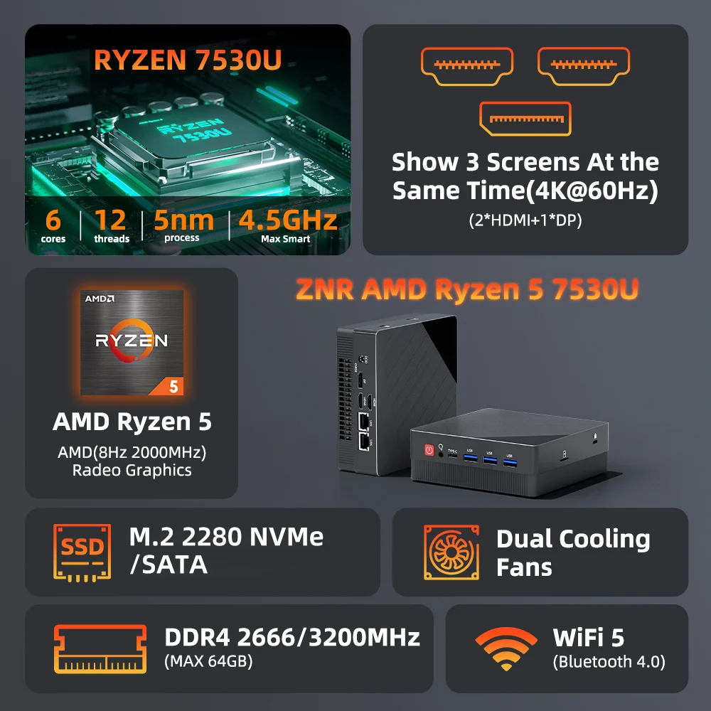 【Liscio e leggero】TexHoo R5-7530U/R3-4300UU/U3 R3-5400U/R3-5300U/4500U è dotato di AMD Ryzen 5 7430U(2.3-4.3GHz, 6 nuclei 12 fili 16M Cache)/AMD Ryzen 3 5400U(2.6-4GHz, 4 core 8 thread 8M Cache)/AMD Ryzen 3 4300U(2.7-3.7GHz, 4 core 4 thread, cache 4M)/AMD Ryzen 3 5300U(2.6-3.8GHz, 4 core 8 fili, cache 4M)/AMD Ryzen 5 4500U(2.3-4.0GHz, 6 core 6 thread, cache 4M), e supporta il sistema operativo Linux.Questo mini PC è adatto per riunioni Zoom/Skype, consente di eseguire Office, PS, surfare l’Internet e guardare il streaming video contemporaneamente.che è ideale per diverse scenari di utilizzo come ufficio, istruzione online, intrattenimento, industria…