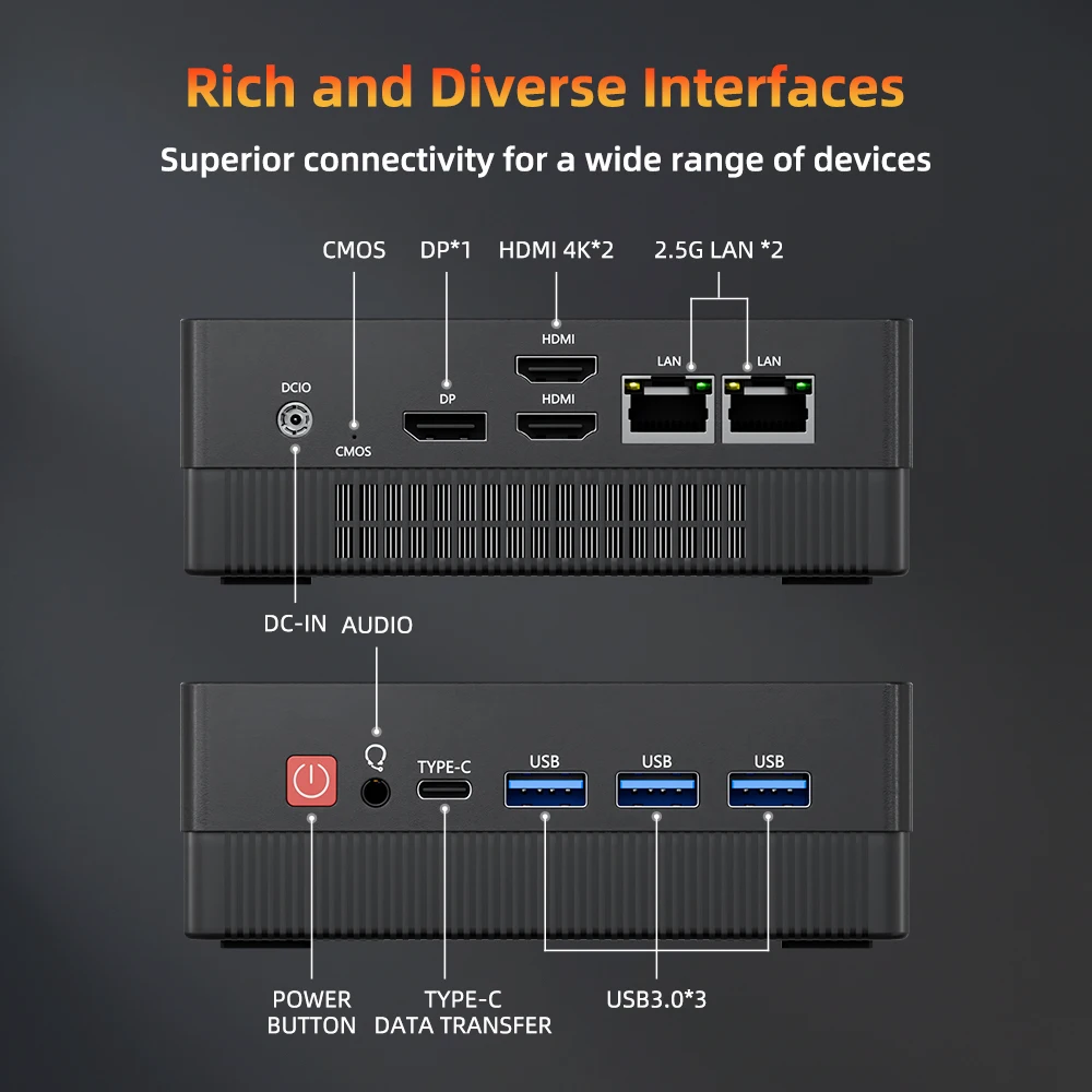 【Design dell’interfaccia ricca】 Il mini computer TexHoo U3 ha una varietà di design di interfaccia (3*USB3.0 5Gbps, 2*HDMI 4K@60Hz, una porta DP 4K@144Hz e una porta Type-C, 2*RJ45 jack audio da 2,5G Mbps LAN, 1*3,5 mm, riacquistituisce facilmente a una varietà di esigenze