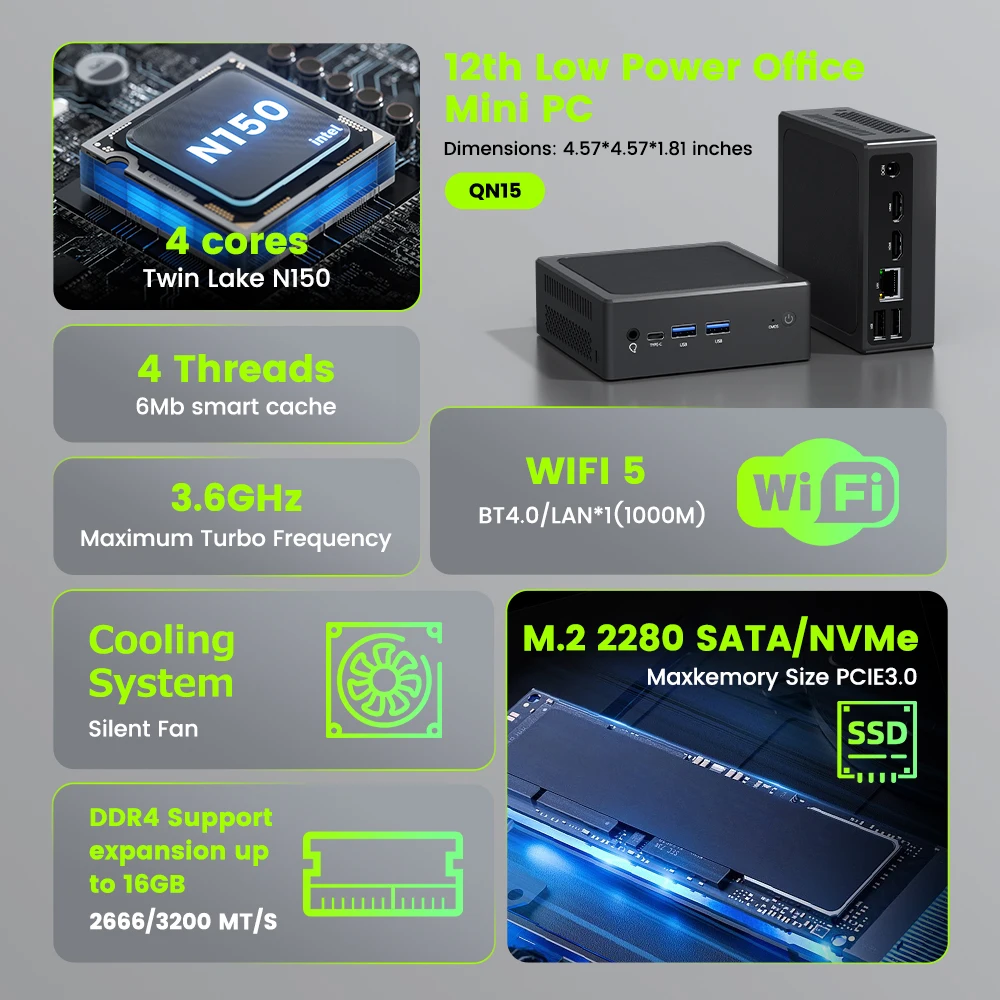 Processore Intel N150, cache 6M, fino a 3,60 GHz, 4 core 4 thread, TDP: 6W