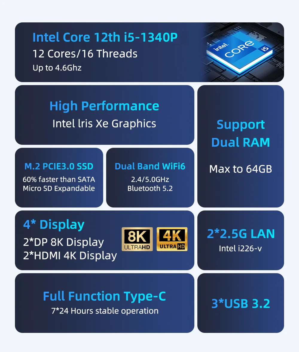 i5-1340P 12 core 16 fili 3,4 GHz ~ 4,6 GHz