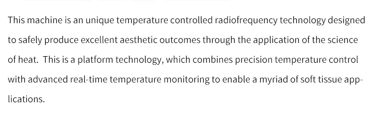 Questa macchina è un unico design con tecnologia a radiofrequenza a temperatura controllata produce in modo sicuro eccellenti apparecchiature estetiche attraverso l’applicazione del calore scienceof.Questa è una tecnologia della piattaforma, che combina il controllo della temperatura di precisione con il monitoraggio avanzato della temperatura in tempo reale per assorbire una myriad di applicazioni in tessuto morbido.