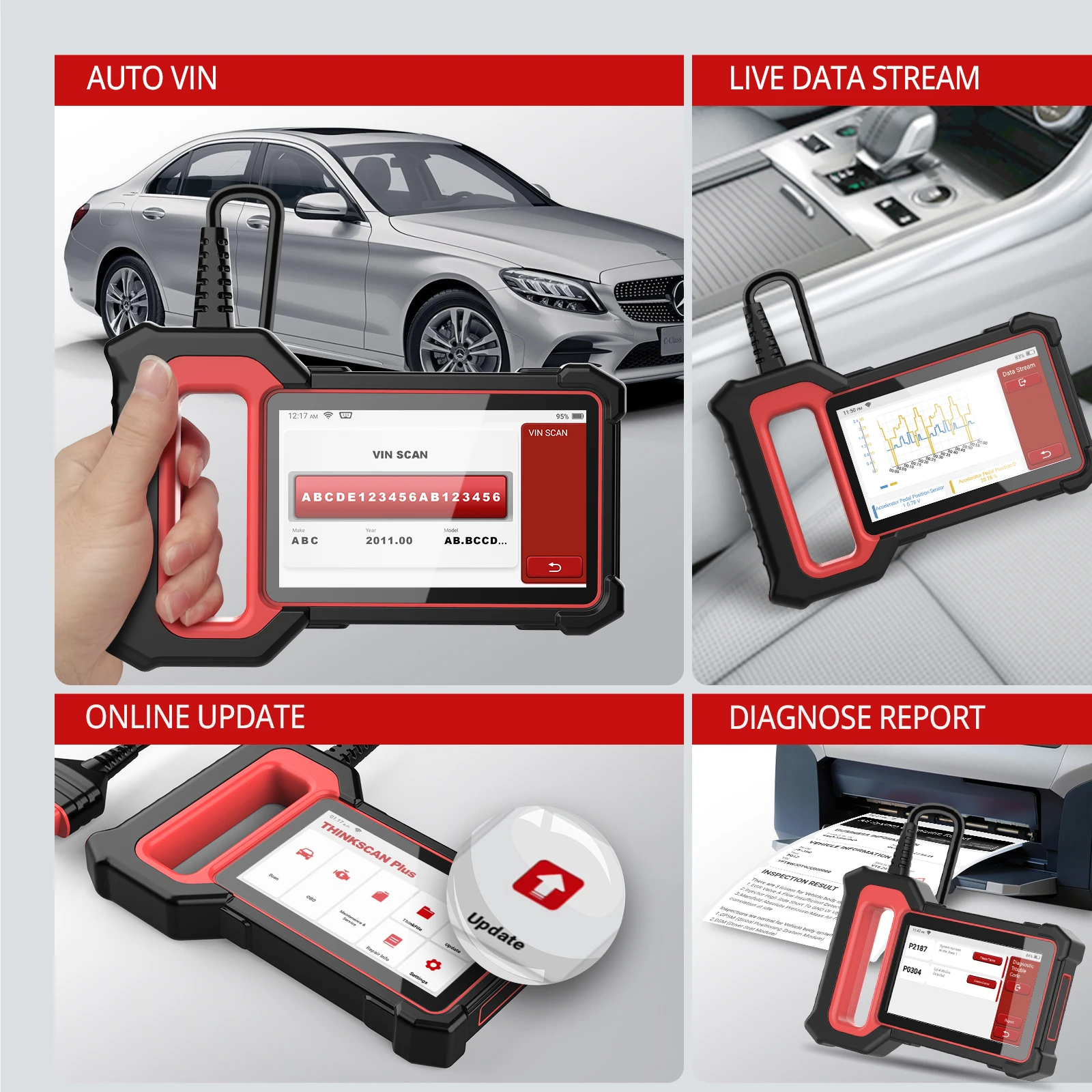 Nota: la batteria integrata di questo prodotto viene utilizzata solo per prevenire possibili perdite di dati quando lo scanner è acceso e spento.Non può alimentare lo scanner.Collegare il veicolo o l’alimentatore per avviare lo scanner.Quando lo si utilizza per la prima volta, caricare lo scanner per circa 2 ore.Quale differenza tra THINKSCAN Plus S5/S6?THINKSCAN Plus S54 Aggiornamento gratuito a vita diagnostica del sistema (ABS/SRS/motore/TCM)Nessuna funzione di ripristino gratuito a vitaTHINKSCAN Plus S64 Aggiornamento gratuito a vita diagnostica del sistema (ABS/SRS/motore/TCM)5 Ripristina l’uso gratuito a vita (Olio+SAS+EPB+TPMS+adattamento dell’acceleratore)THINKSCAN PLUS S5/S6 supporta 4 sistemi diagnostici a vita aggiornamento gratuitoQuesto scanner obd2 per auto è in grado di leggere e cancellare i codici di errore di ABS/SRS/ECM/TCM/motore.1.Diagnosi ABS:Accedendo al sistema ABS per visualizzare il flusso di dati in tempo reale e recuperando i codici di errore, questo scanner può risolvere il problema dell’ABS con un’ispezione visiva di tutti i componenti dei freni che hanno causato la spia e spegnere la luce.2.Diagnosi SRS:Rilevando ogni parametro elettronico nel sistema SRS per verificare il loro stato di salute, questo strumento diagnostico può risolvere tempestivamente i potenziali problemi SRS per garantire la sicurezza di guida e spegnere la spia dell’Airbag.3.Diagnosi ECM:È possibile diagnosticare il sistema del motore tramite la porta ecu obd2, supportare tutte e 10 le modalità di test OBDII, come dati in tempo reale, test del sensore O2, test dei componenti e altro;leggere e cancellare i codici di errore del motore, scoprire esattamente il problema, ripararlo e spegnere la spia del motore MIL.4.Diagnosi TCM:AT è un insieme di trasmissione utilizzata per coordinare la velocità del motore e la velocità effettiva della ruota, che viene utilizzata per sfruttare appieno le migliori prestazioni del motore.Lo scanner MUCAR CS4 obd2 può leggere/cancellare codici e visualizzare dati in tempo reale per recuperare le informazioni sull’errore da AT.Lo scanner ThinkScan Plus S5/S6 OB2 supporta le modalità di test OBD2 complete:*-Leggere rapidamente i codici ampie, in sospeso e permanenti nel sistema OBD*-Cancella i codici di errore rilevati e spegni la spia di controllo del motore in modo efficiente*-Visualizza dati grafici in tempo reale dei moduli computeristici del veicolo per semplici analisi*-Visualizza i parametri operativi del veicolo nel momento in cui viene rilevato un DTC*-Leggere lo stato di disponibilità I/M per avere un veicolo ispezionato per verificarne la conformità alle emissioni dello stato*-Eseguire il test del sensore O2 per verificare l’efficienza del carburante e le emissioni del veicolo*-Leggere i risultati dei test di monitoraggio diagnostico di bordo per componenti/sistemi specifici*-Ripristina completamente le informazioni sul veicolo di VIN, CIN e CVN*-Eseguire il componente Test consentendo l’avvio di un test di tenuta per il sistema EVAP del veicoloTHINKSCAN Plus S5Nessuna funzione di ripristino gratuito a vitaTHINKSCAN Plus S65 Ripristina l’uso gratuito a vita (Olio+SAS+EPB+TPMS+adattamento dell’acceleratore) *Non tutti i veicoli supportano tutte le funzioni di ripristino.Si prega di inviare il modello e l’anno del veicolo al servizio clienti per richiesta.1.Ripristino dell’olioSe la luce per la manutenzione dell’olio è accesa, è necessario mantenere l’auto.Dopo la manutenzione, il tempo di guida e altri dati devono essere ripristinati a zero, in modo che la spia di manutenzione venga spenta e il sistema dell’auto consentirà un nuovo ciclo di manutenzione.2. Ripristino del freno1.Quando il freno viene utilizzato fino a un certo spessore, la linea del sensore del freno verrà usurata e la linea del sensore delle pastiglie freno invierà un segnale al computer dell’auto per richiedere la sostituzione della pastiglia del freno.Dopo aver sostituito le pastiglie dei freni, è necessario reimpostare il freno, altrimenti l’auto emetterà comunque un allarme.2.È necessario eseguire la situazione di ripristino:UN. sostituire la pastiglia freno e la linea di induzione dell’usura delle pastiglie freno;B. spia della pastiglia freno accesa;C. riparazione del cortocircuito della linea del sensore delle pastiglie dei freni;d. Dopo aver sostituito il servomotore3. Ripristino dell’angelo dello sterzo SASDopo che il veicolo è stato smontato o sostituito con parti relative alla funzione di sterzata, è necessario eseguire la funzione di apprendimento dell’angolo di sterzata.4. Ripristino della pressione dei pneumatici TPMSapplicabile solo ai veicoli senza sensori di pressione dei pneumatici.se la pressione dei pneumatici è troppo bassa o perde aria, sostituire o installare apparecchiature di monitoraggio della pressione dei pneumatici, sostituire pneumatici, danni ai sensori di pressione dei pneumatici e automobili con funzione di monitoraggio della pressione dei pneumatici in caso di trasposizione dei pneumatici, ecc.È necessario il ripristino della pressione dei pneumatici dopo la manutenzione del veicolo e spegnere la spia di guasto della pressione dei pneumatici.5.Apprendimento SET (corrispondenza dell’acceleratore)È necessario eseguire la corrispondenza dell’acceleratore: sostituire l’unità di controllo elettronica, spegnere l’unità di controllo elettronica, sostituire il gruppo acceleratore elettronico, sostituire o smontare la porta di aspirazione, pulire l’acceleratore.La diagnostica copre la maggior parte dei veicoli che supportano il protocollo OBDII dopo il 1996.Per l’Americaper Buick, per Chrysler, per Cadillac, per Chevrolet, per Doge, per AU Ford, per Fiat brasiliano, per GM brasiliano, per Ford, per GM, per Jeep, per Lincoln, per SGMPer l’Europaper Aston Martin, per Audi, per Alfa Remeo, per Abarth, per BMW, per Bentley, per Bugatti, per Citroen, per DR, per Dacia, per EU Ford,