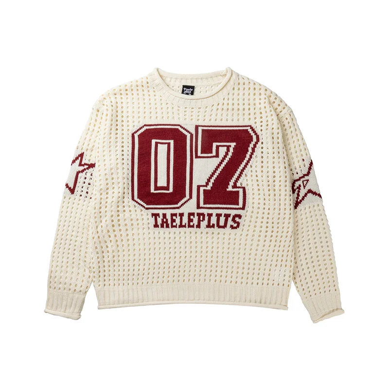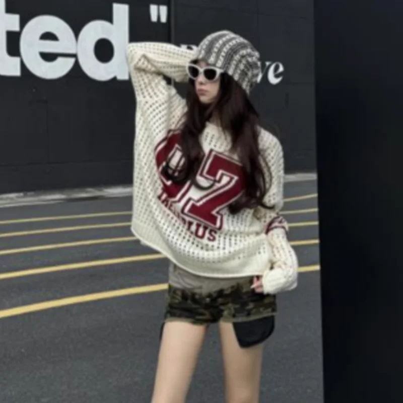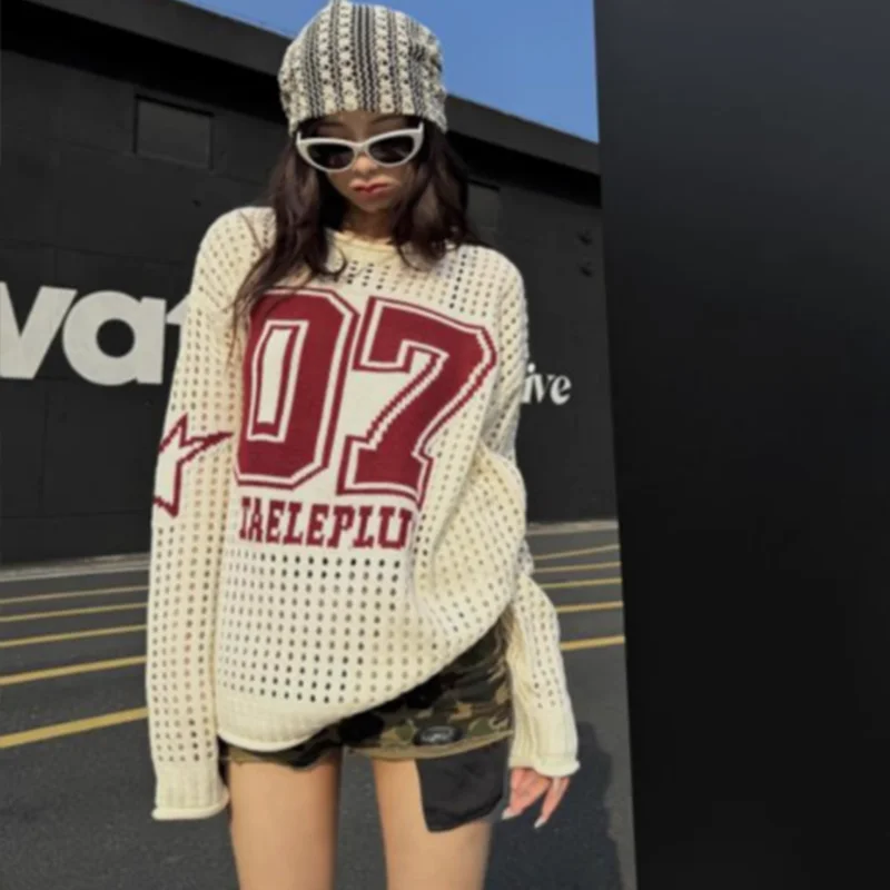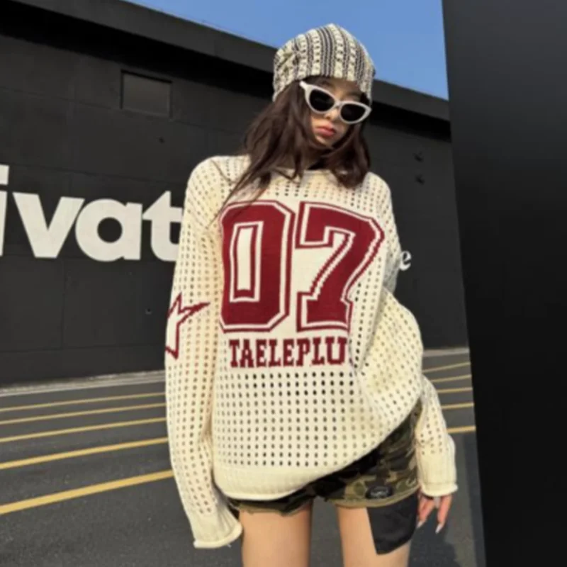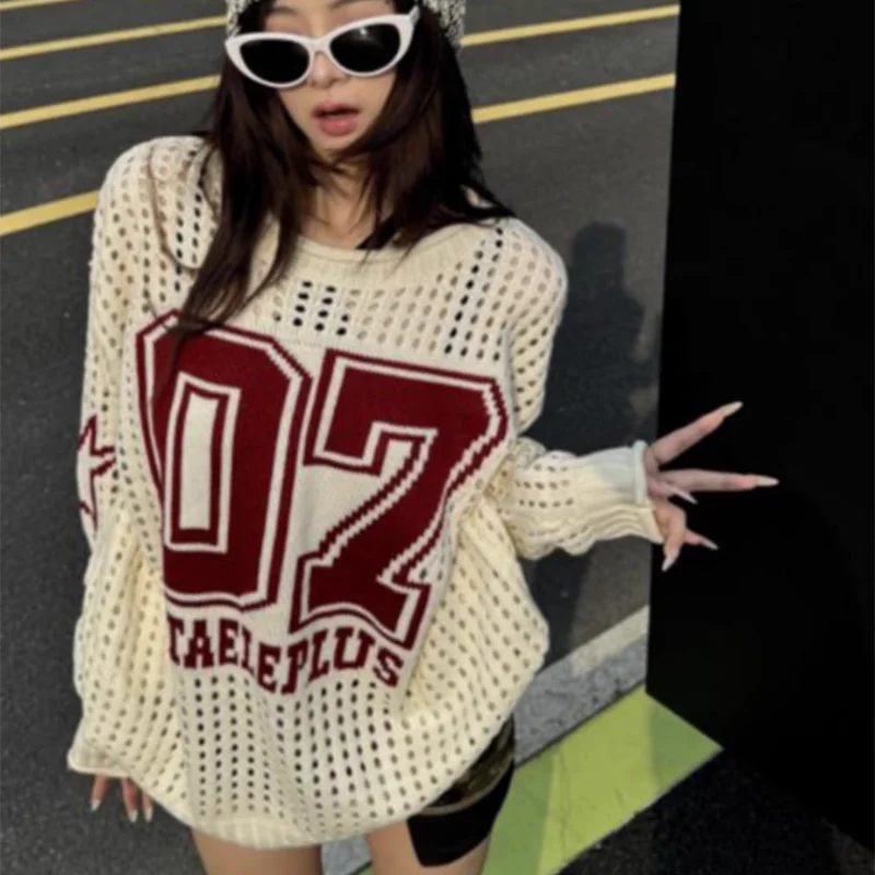 Maglione pullover oversize, stampa numeri, manica lunga, top in maglia all’uncinetto, top con spalle scoperte, camicia in jersey lavorato a maglia, pullover in maglia da spiaggia
