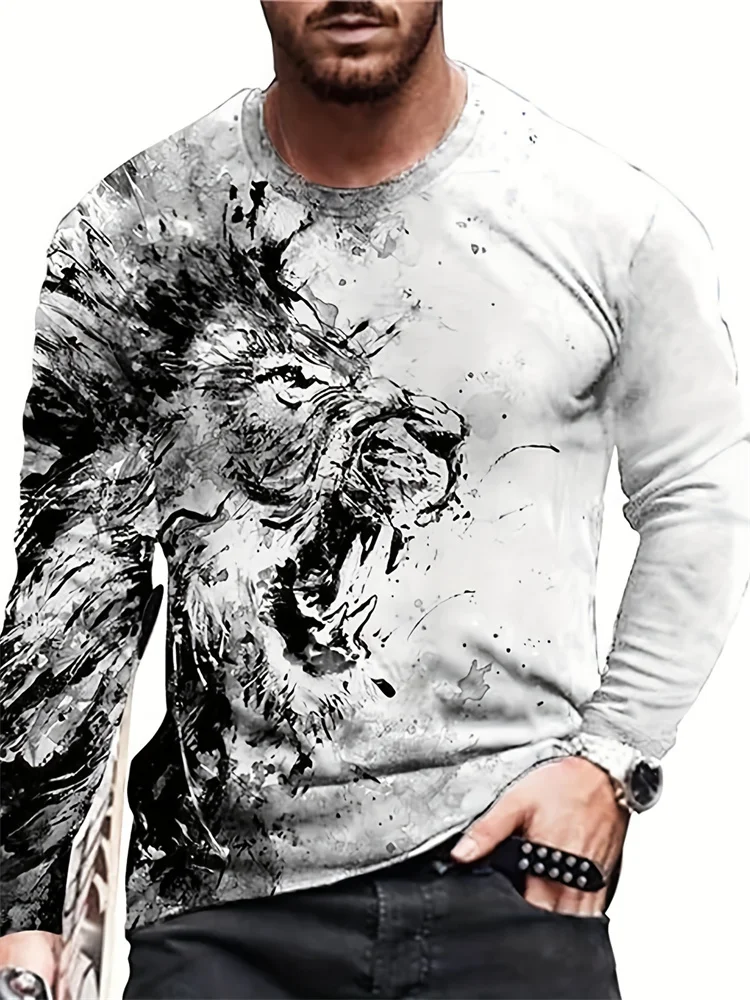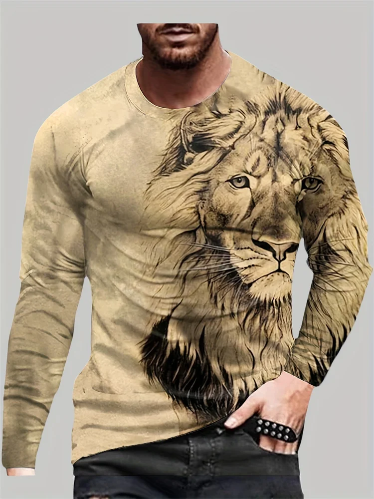 Top da uomo autunno e inverno con stampa leone 3D T-shirt a maniche lunghe da uomo casual per tutti i giorni Top a maniche lunghe da uomo alla moda di strada all’aperto