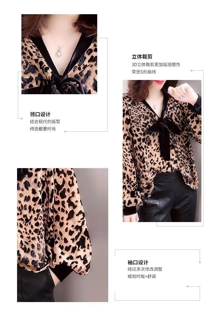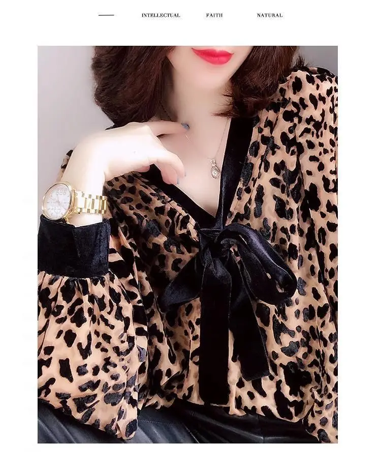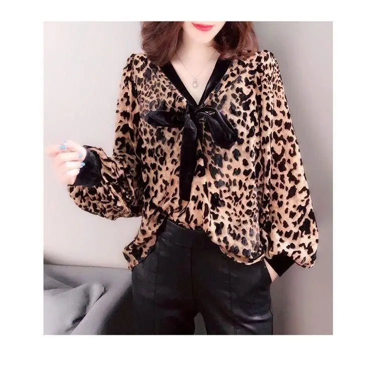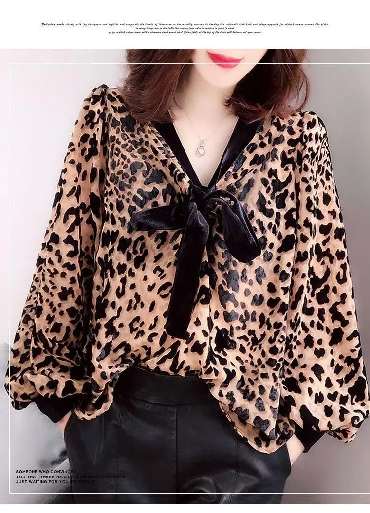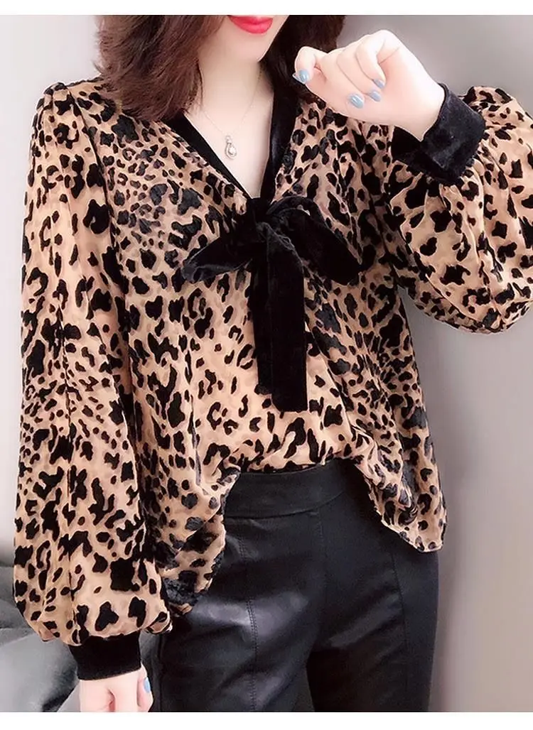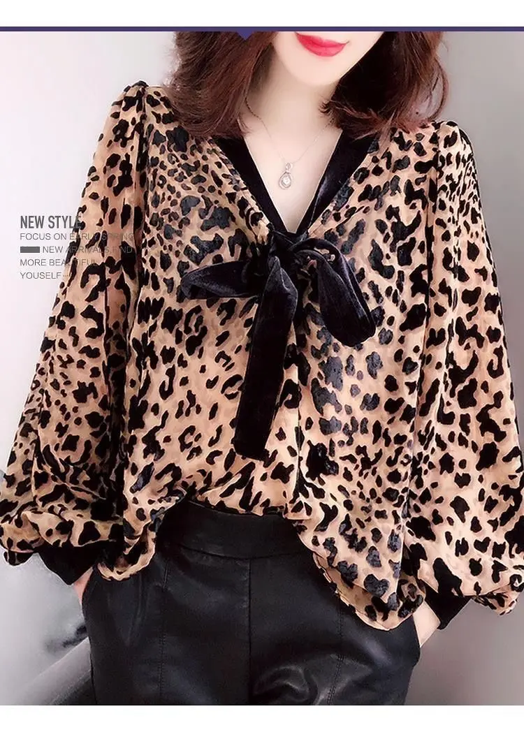Top in chiffon leopardato T-shirt primavera autunno allentate con scollo a V T-shirt oversize moda patchwork fiocco camicie larghe abbigliamento donna Top Tee