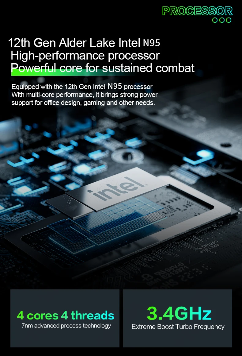 1.Intel Alder Lake N95 4 core 4 thread max 3,4GHz con grafica Intel UHD, TDP 15W