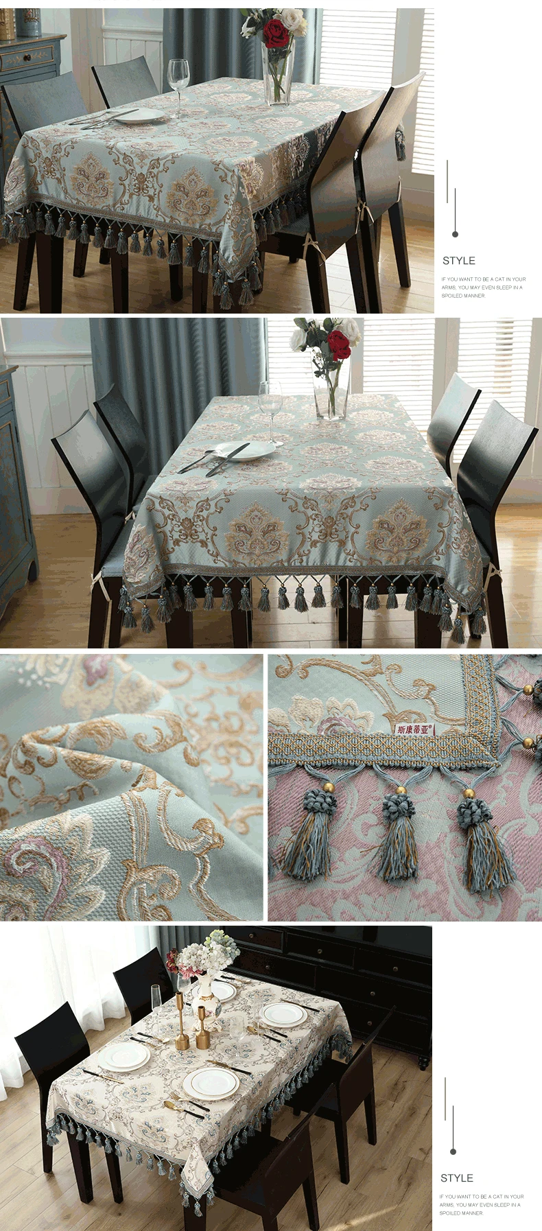 (1) nome del prodotto: tovaglia floreale densa di lusso europea sul tavolo con nappe.