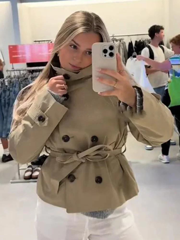 Trench da donna con cintura a maniche lunghe moda 2025 Autunno Colletto alla coreana Giacca doppiopetto Lady High Street Chic Capispalla