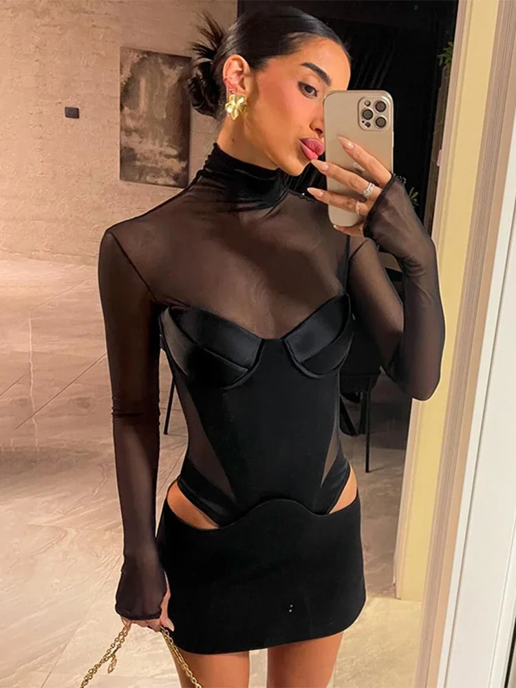 Trendix Mini abito a maniche lunghe in rete alla moda Club See Through Dolcevita Splice Hollow Body Dress Party Hot Girls Abito sexy 1Trendix Mini abito a maniche lunghe in rete alla moda Club See Through Dolcevita Splice Hollow Body Dress Party Hot Girls Abito sexy