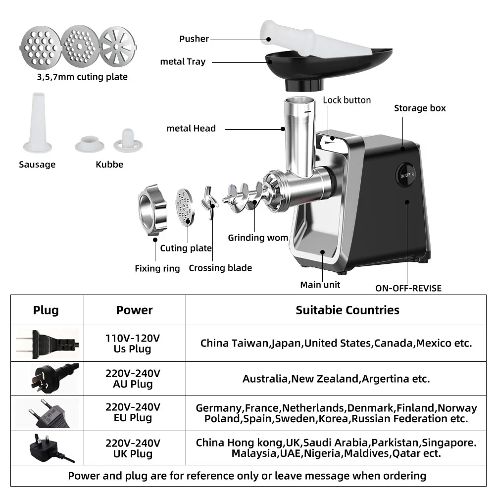 Viene fornito con tre piastre da taglio in acciaio resistenti (5 mm, 7 mm, a forma di ventaglio) per una macinazione grossolana, media o fine.Include 4 accessori per ripieno di salsicce per realizzare stili diversi come italiani o hot dog.
