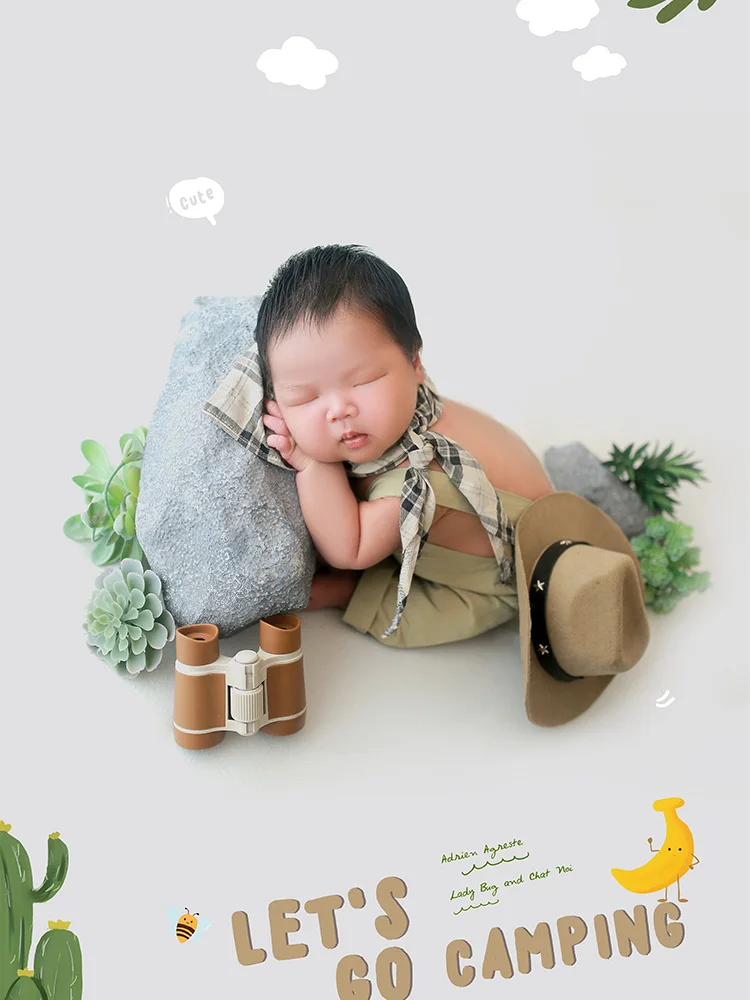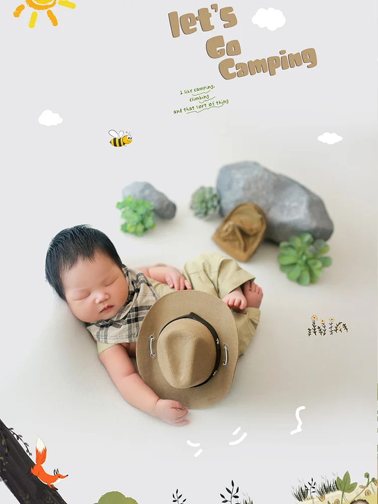 Dimensioni: dimensioni libere Adatto per: 0-1 mese bambino Genere: ragazzo/ragazza Il pacchetto Include: coperta di sfondo, completo, pianta verde, oggetti di scena per foto