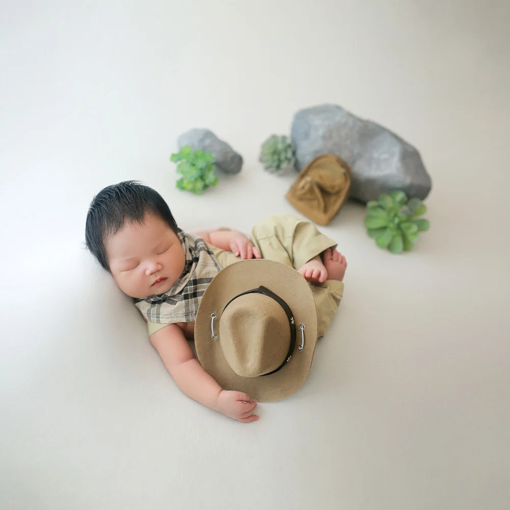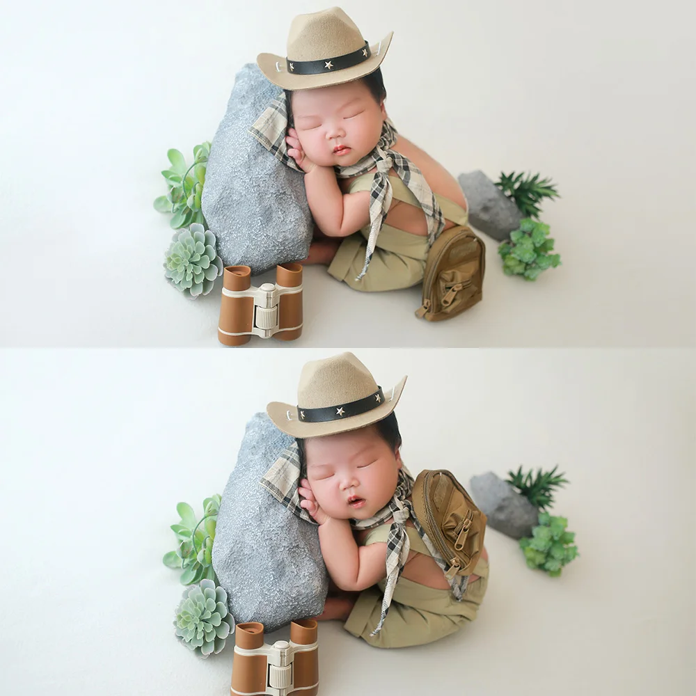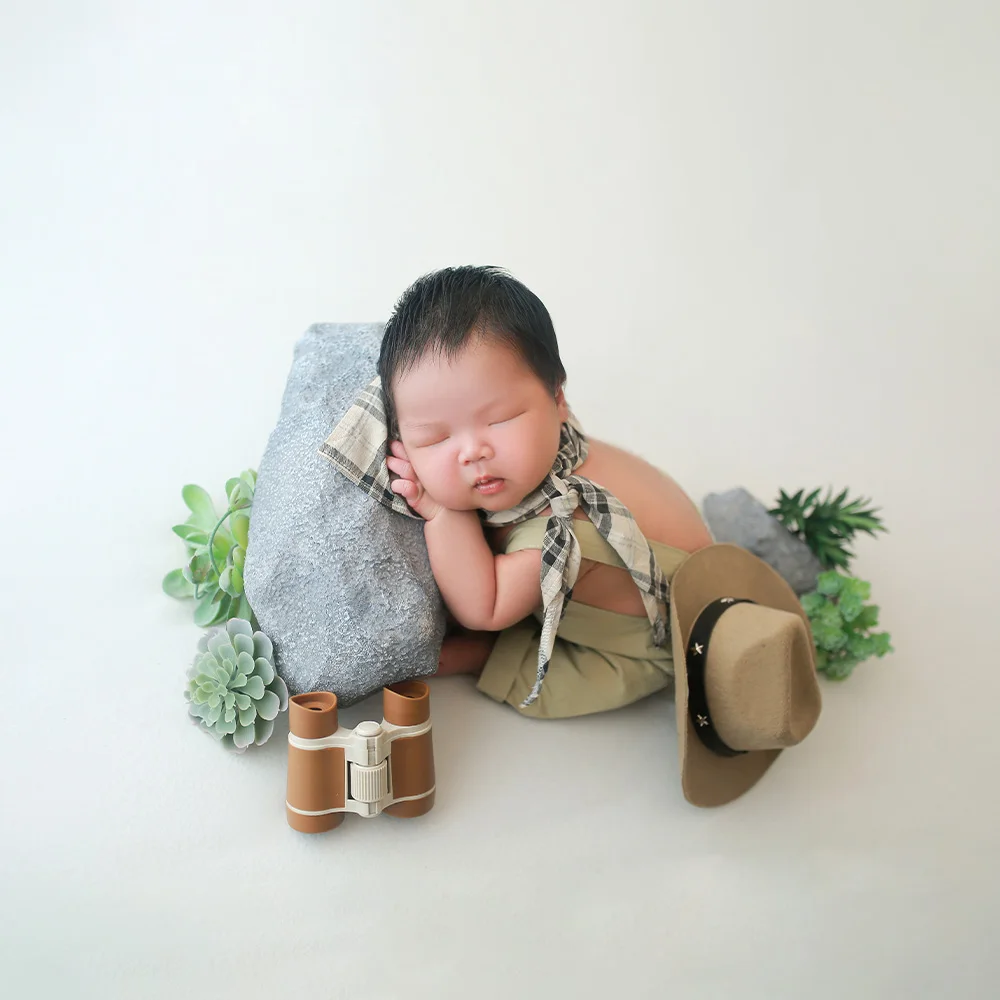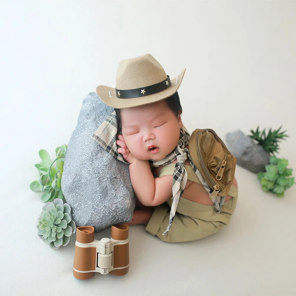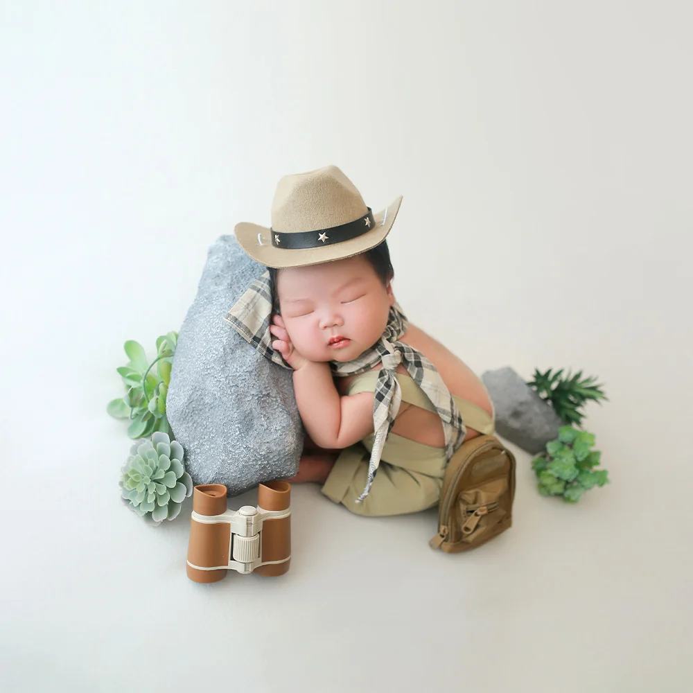 Tuta da neonato tuta da Cowboy cappello da Cowboy sciarpa a triangolo tuta da esploratore fotografia neonato vestito binocolo zaino servizio fotografico Prop