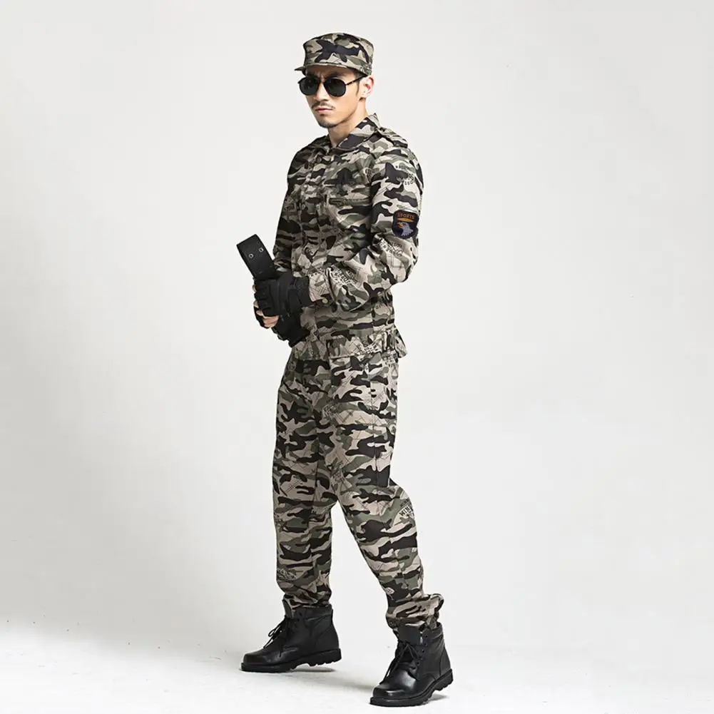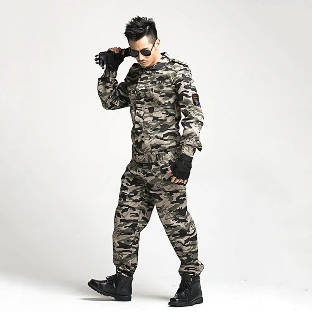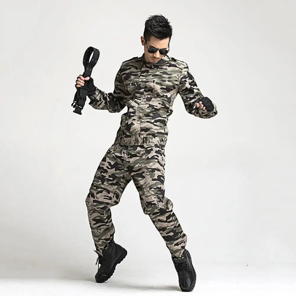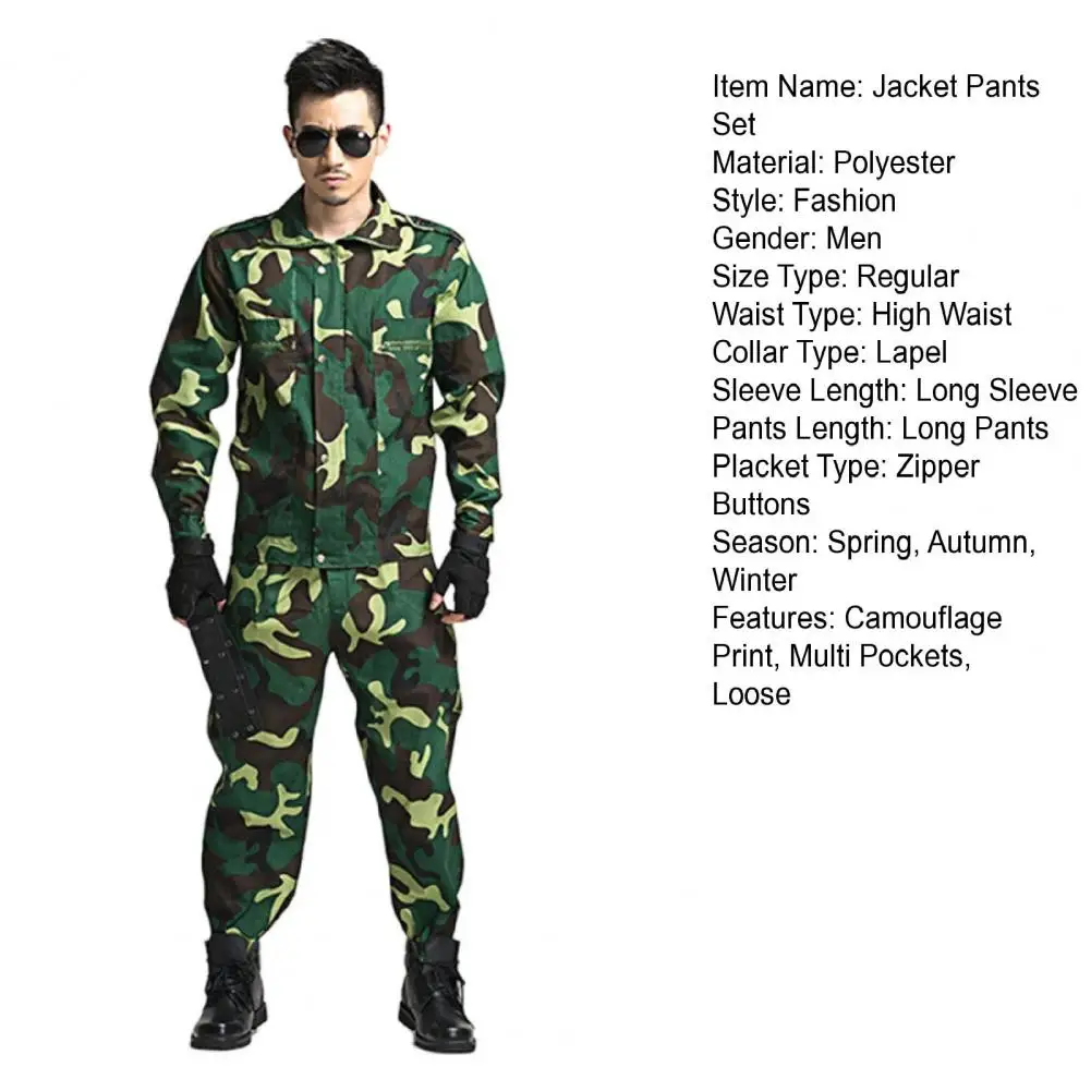 2Pcs/Set Lapel Long Sleeve Zipper Buttons Placket Cargo Coat Pants Men Multi Pockets Camouflage Print Work Training Outfit Male Clothing