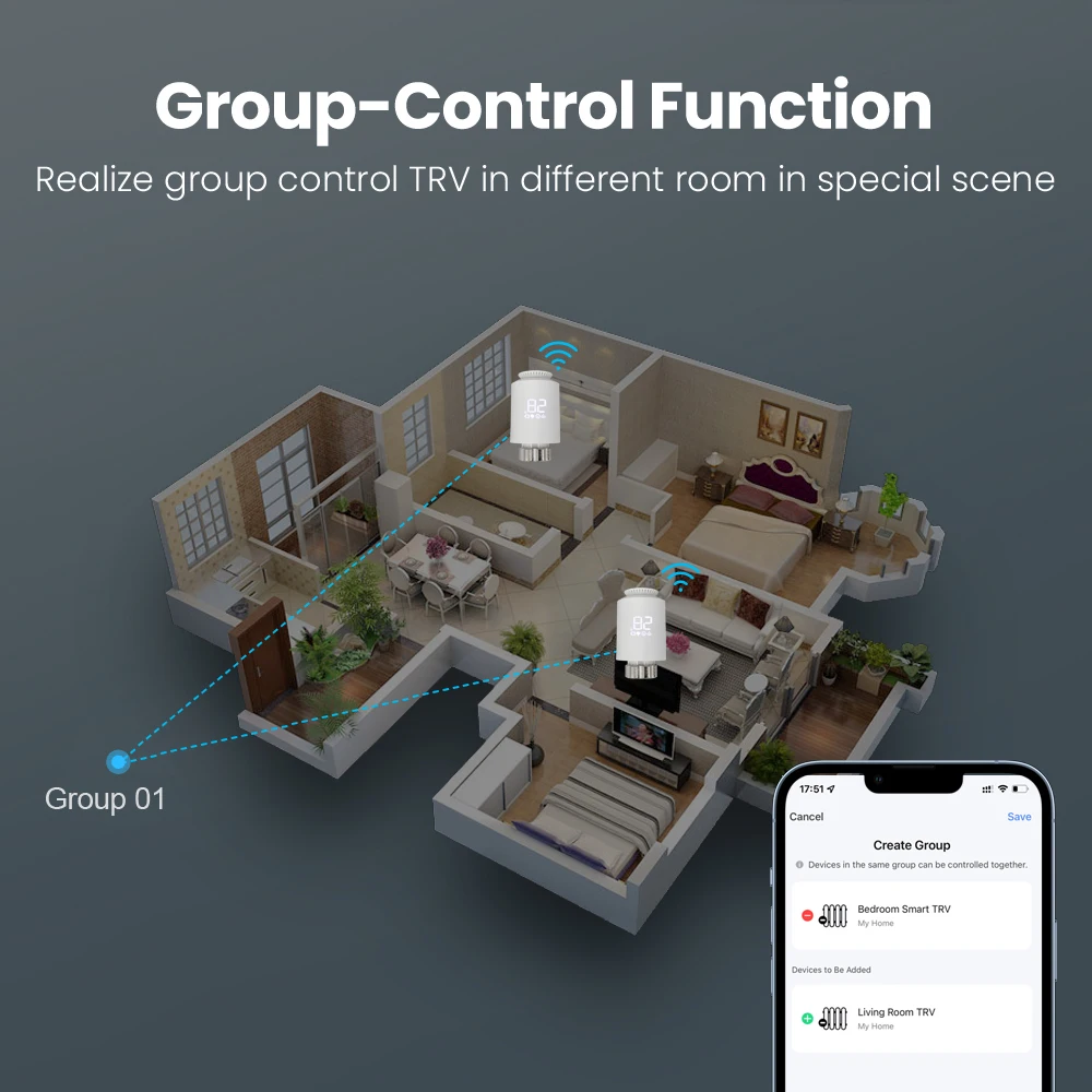 [Funzione di controllo del gruppo] – TRV può eseguire il controllo del gruppo con valvole in diverse stanze, completamento della funzione di controllo del gruppo negli scenari speciali.