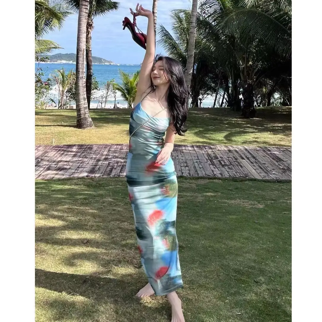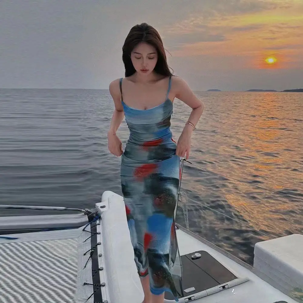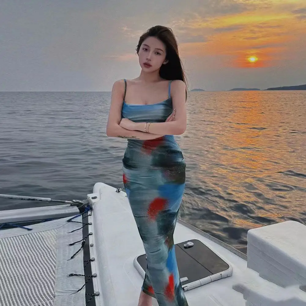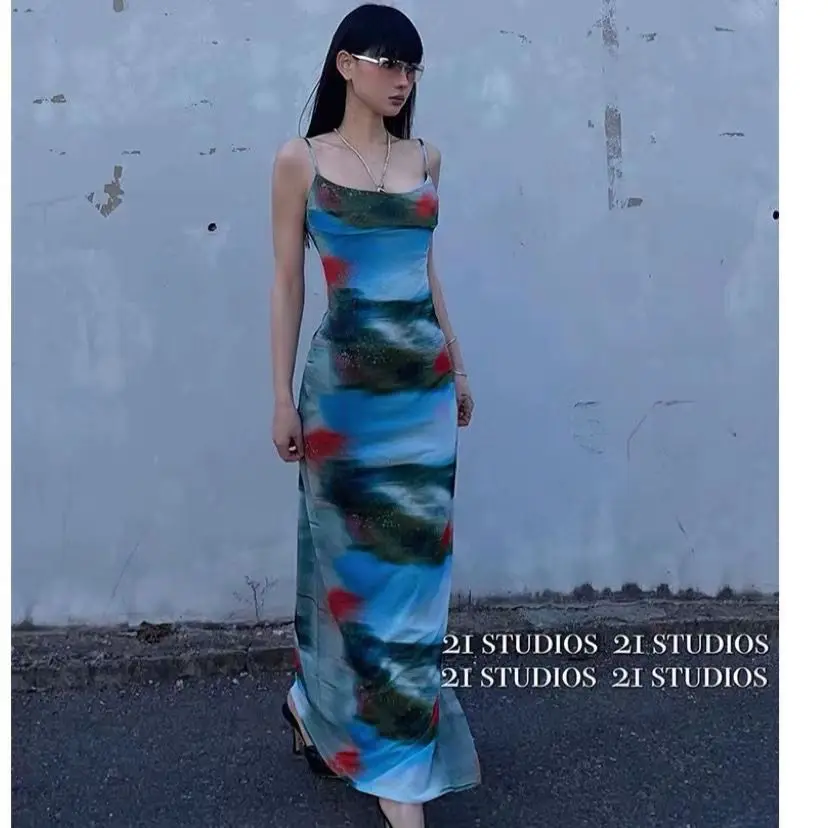 Vacation Feel Retro Sunset Tie Dye Stampa Halter Abito lungo Dimagrante Abito senza spalline Design Sensation Spicy Girl Pure Desire