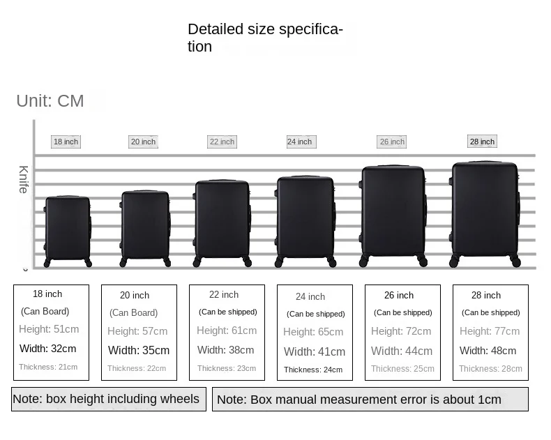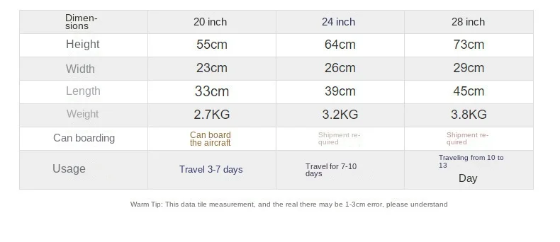 (3) Le specifiche SKU sei selezionate durante il posizionamento dell’ordine riflettono le dimensioni accurate della valigia. Le dimensioni stampate sulla scatola da imballaggio potrebbe diverse, come la stessa scatola possono essere utilizzate per più modelli di valigie. Per favore non preoccuparti.