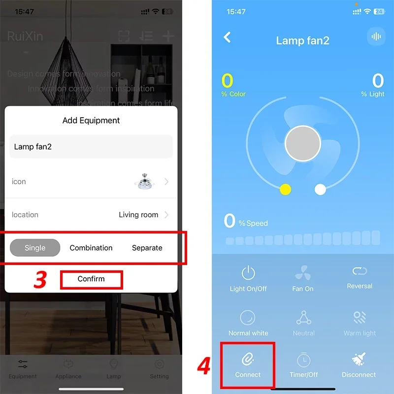 Telecomando il tuo ventilatore da soffitto intelligente con il controller collegato o l’APP intelligente scarica.Il ventilatore e le luci possono essere controllati separatamente.Non devi camminare per accedere all’interruttore ogni volta che devi regolare la sua impostazione dei ventilatori a soffitto con luci e telecomando.
