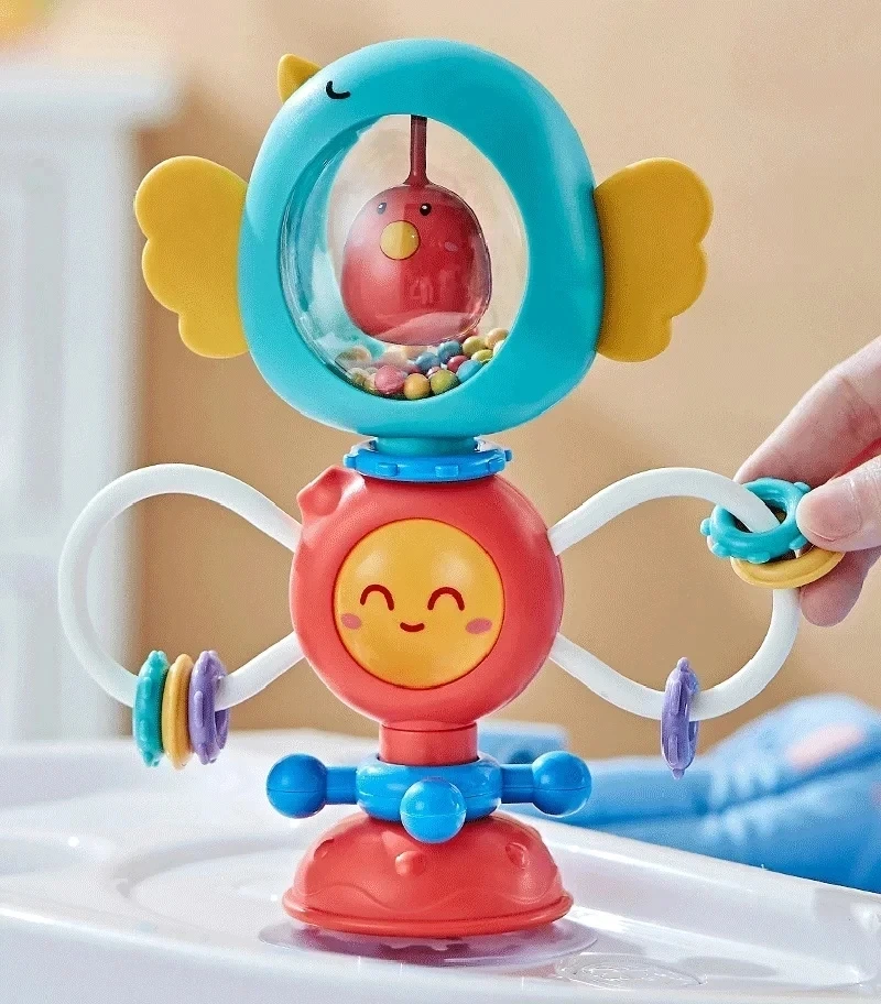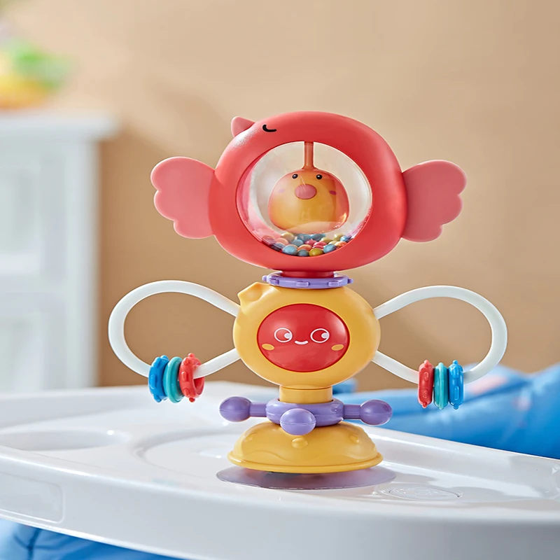 Promuove il motore FINE: sviluppa destrezza e coordinazione con questo giocattolo con ruota panoramica per bambini scuotendo, ruotando, rotando su una superficie e giocando con gli anelli. La base ha anche una ventosa per la stabilità!
