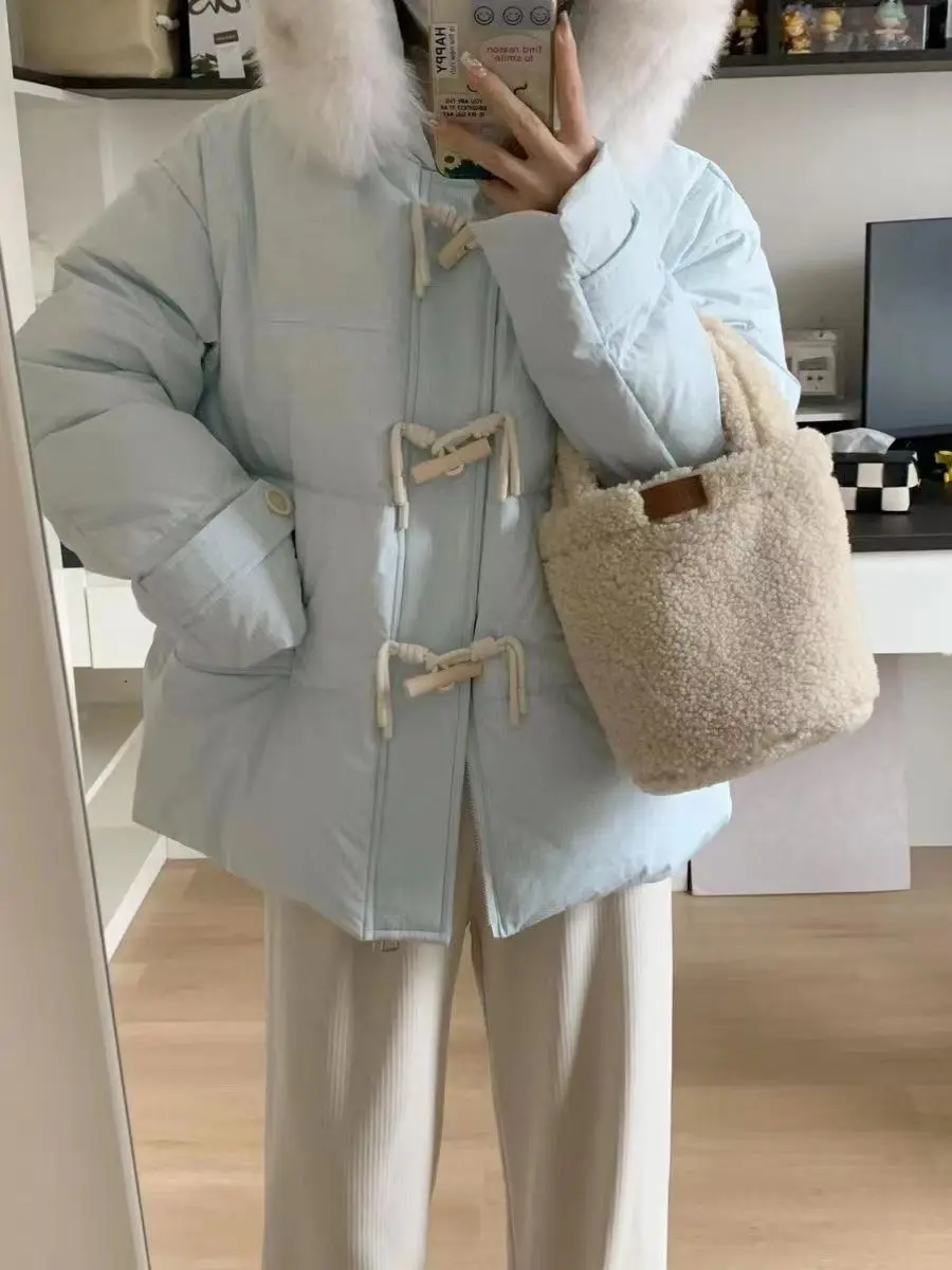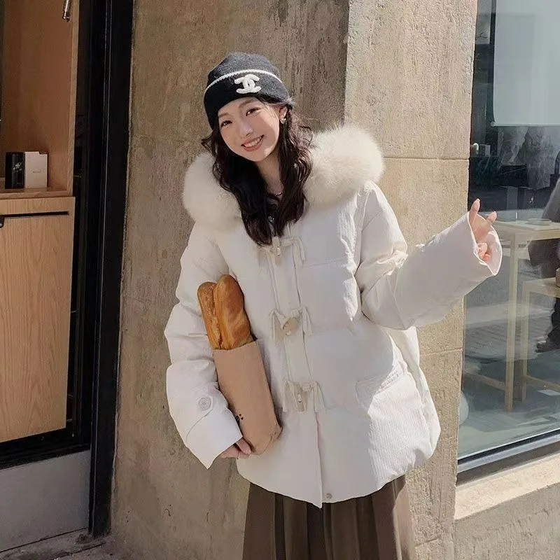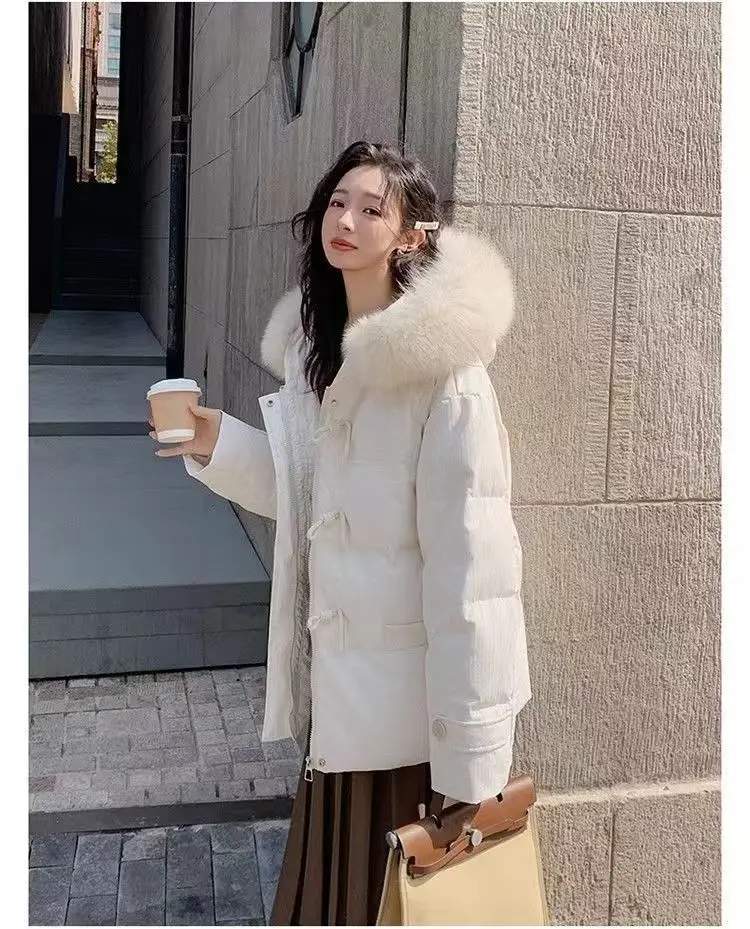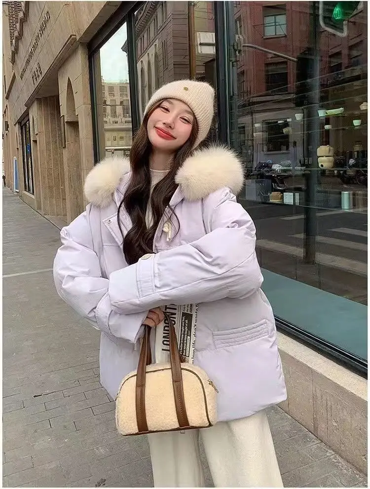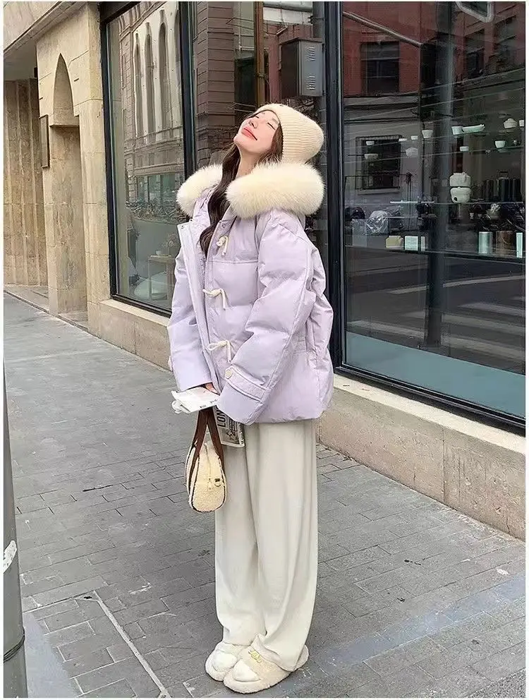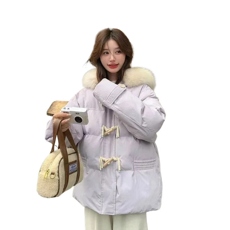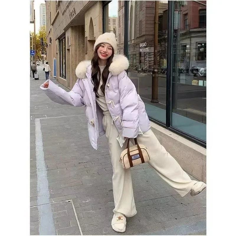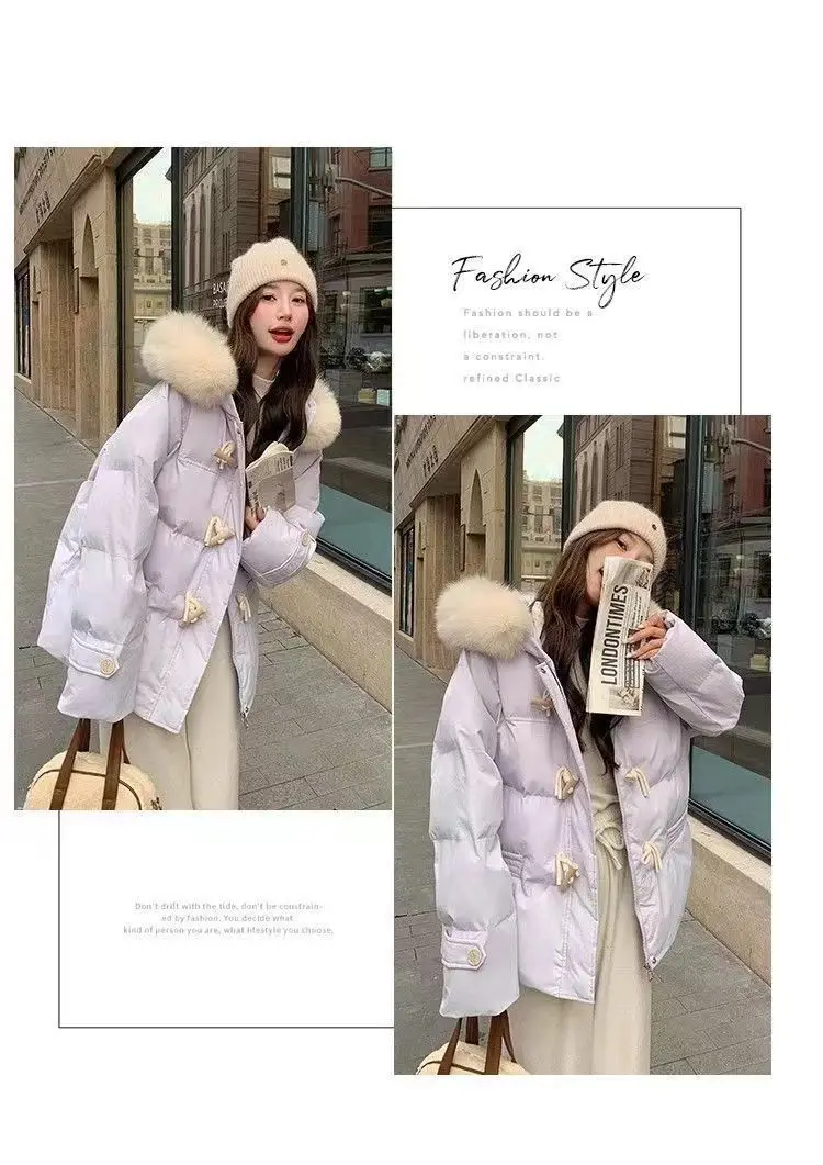 cotone imbottito a mano versione leggera, fibbia in corno viola vestiti di cotone giacca invernale da donna con colletto in pelliccia grande allentato giacca di pane ispessita