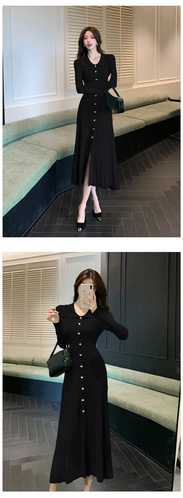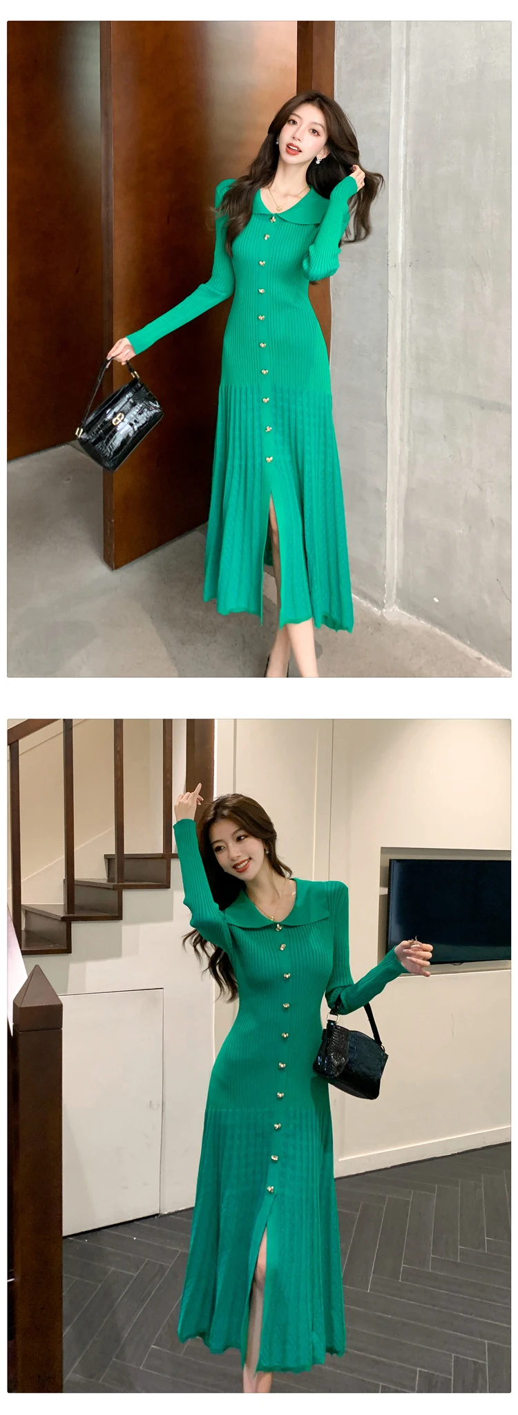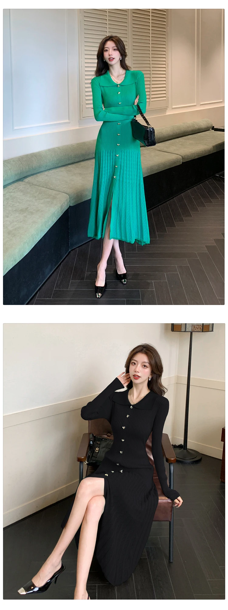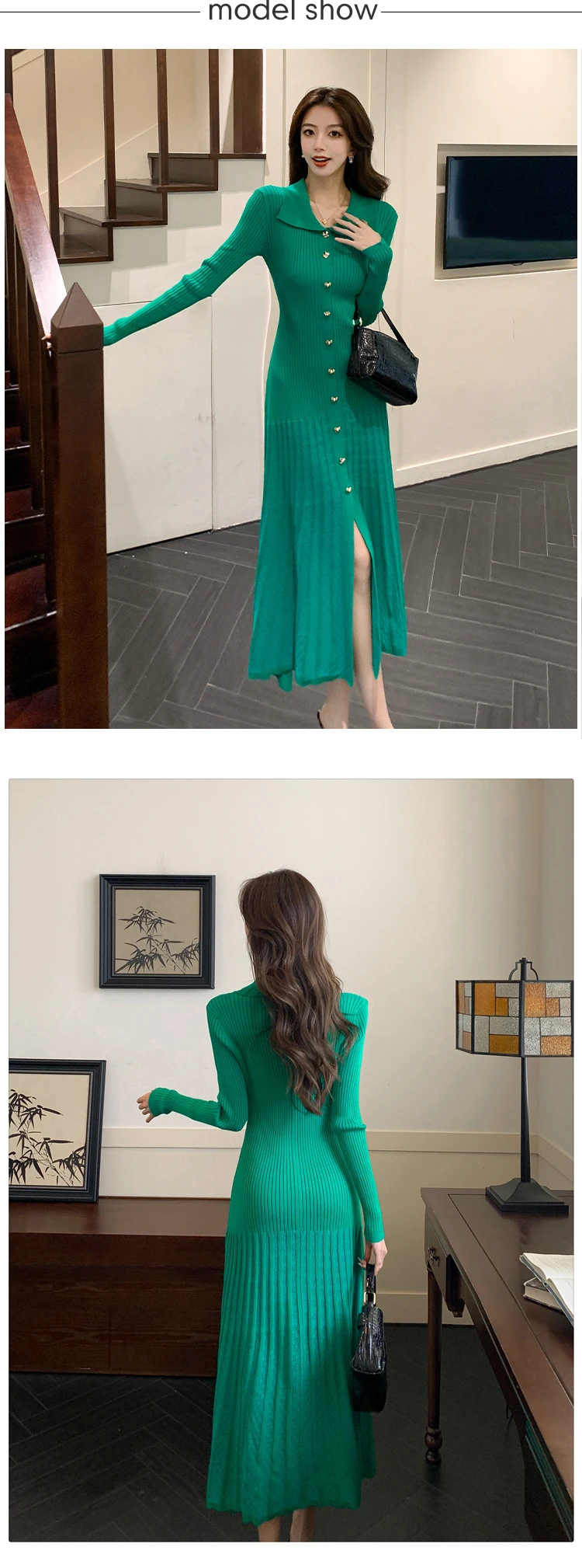 Vestiti delle donne Lavorato a maglia Risvolto Monopetto Skinny Fishtail Abito lungo Maglione Casual Elastico Robe Mujer Abiti Autunno Inverno