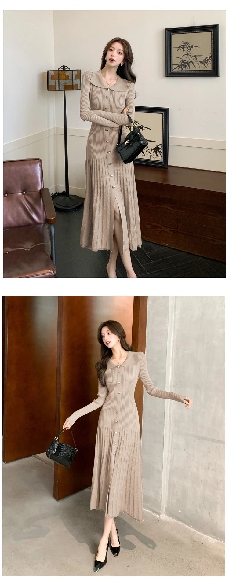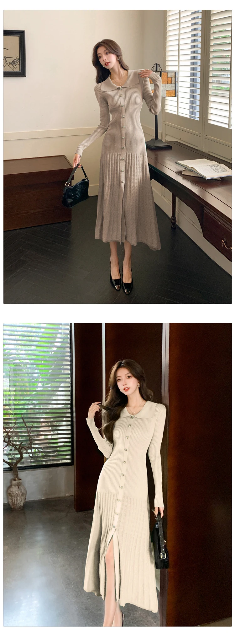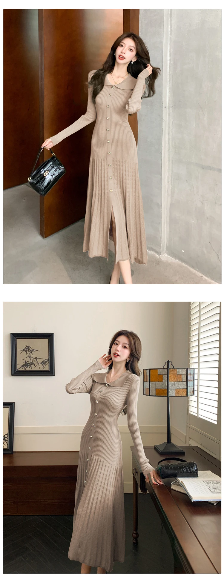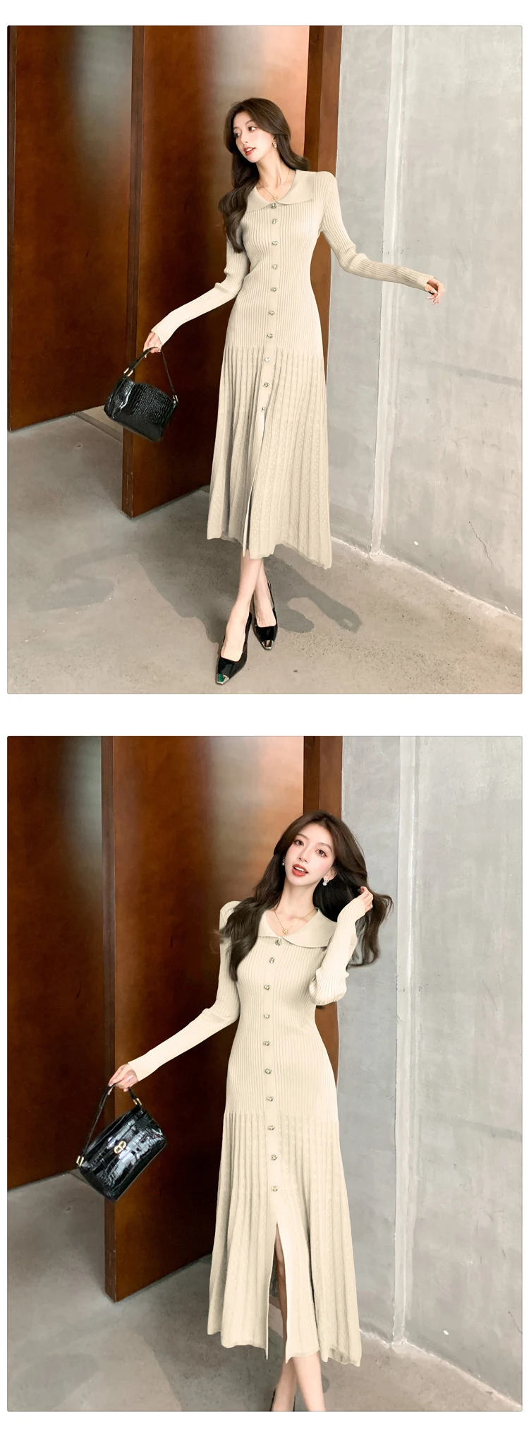 Vestiti delle donne Lavorato a maglia Risvolto Monopetto Skinny Fishtail Abito lungo Maglione Casual Elastico Robe Mujer Abiti Autunno Inverno