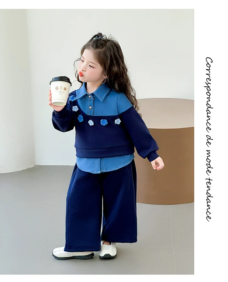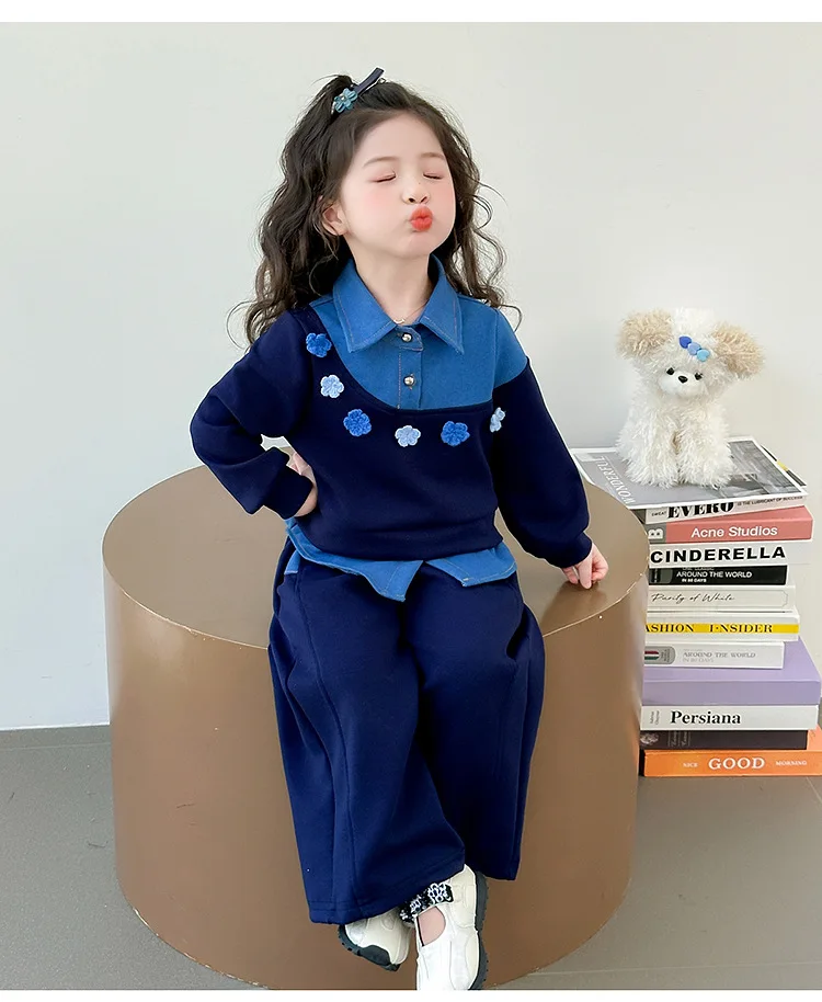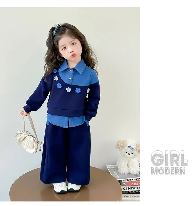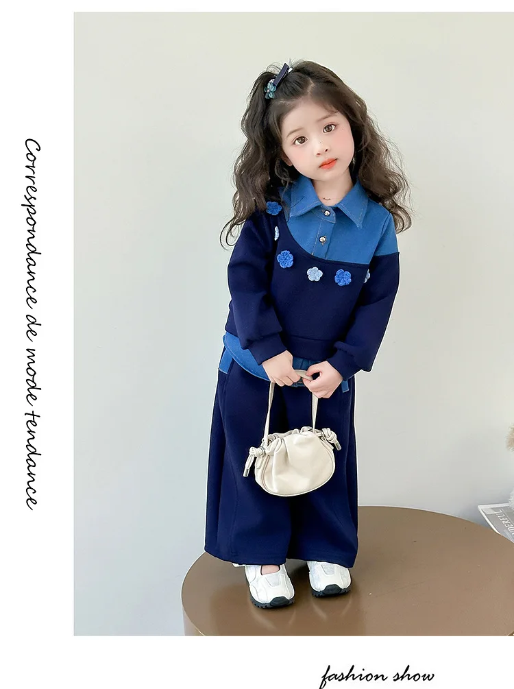 Vestito per ragazze 2025 Autunno e inverno Nuovi vestiti per bambini Ragazze Moda per bambini Cuciture Fiori da cowboy Due set di casual semplici