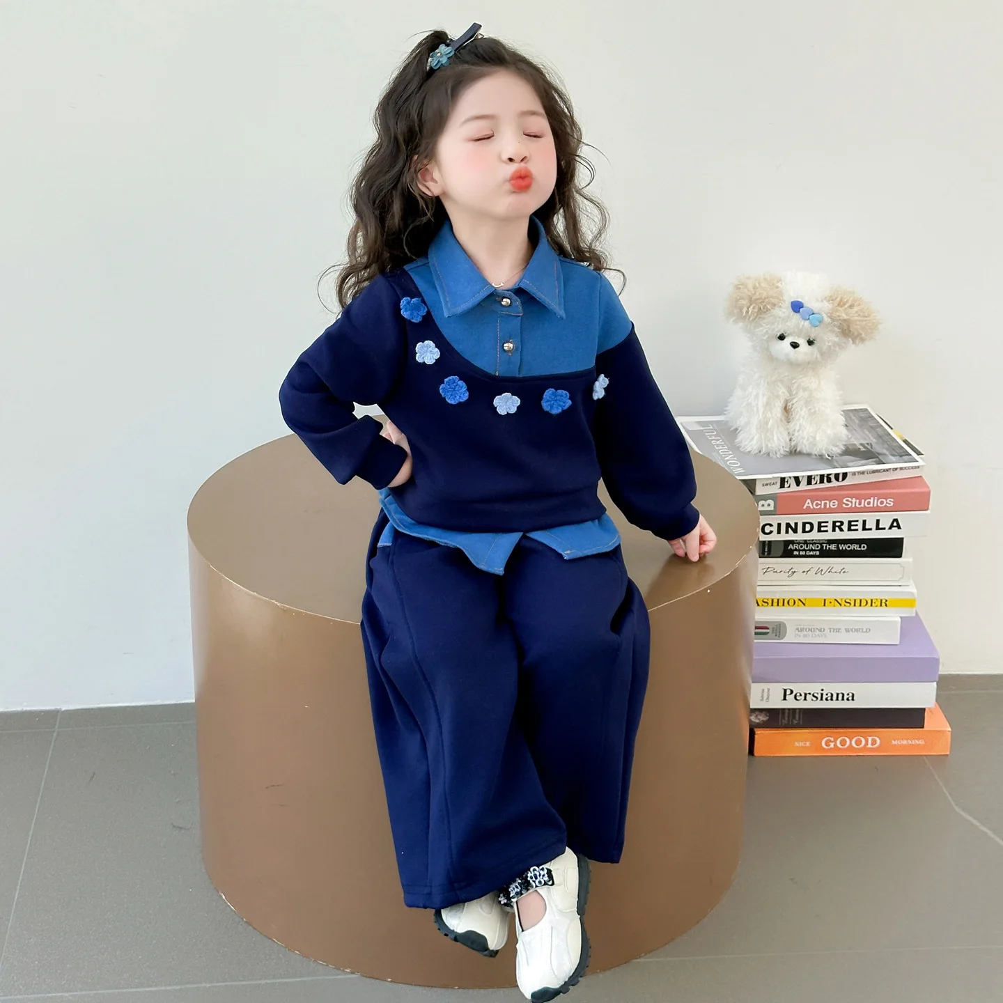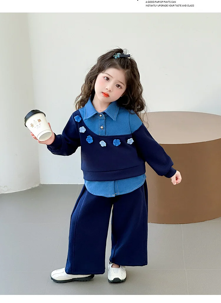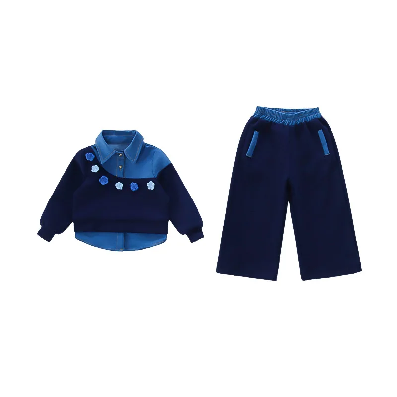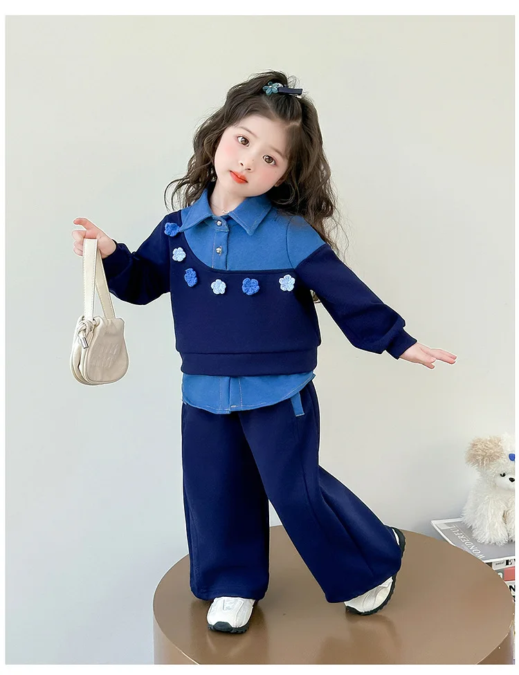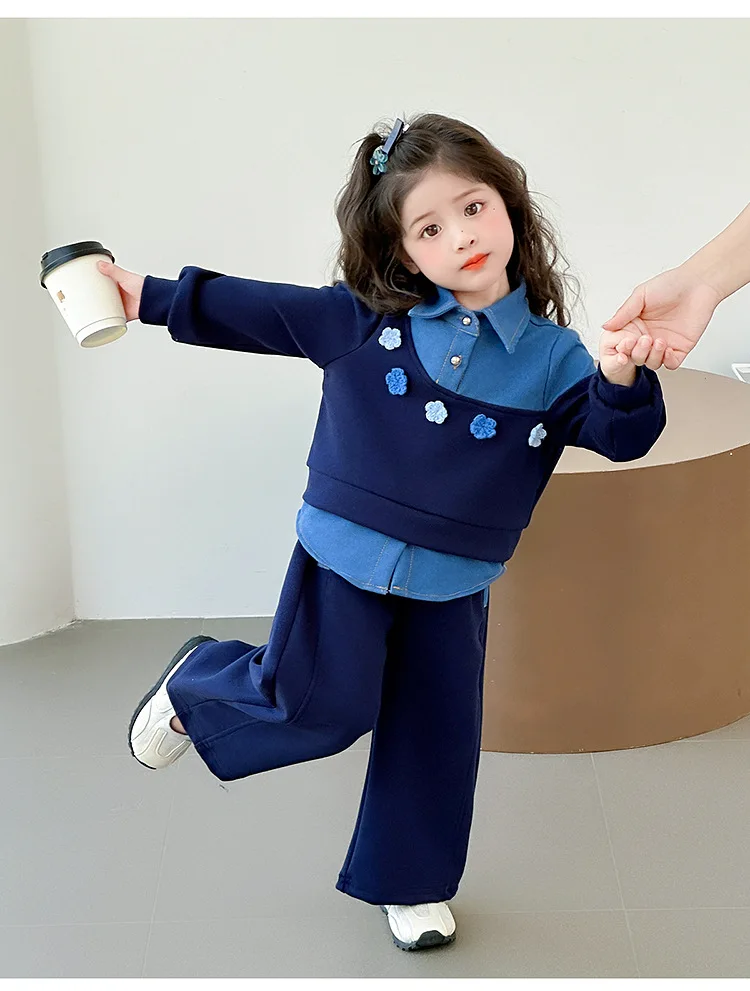 Vestito per ragazze 2025 Autunno e inverno Nuovi vestiti per bambini Ragazze Moda per bambini Cuciture Fiori da cowboy Due set di casual semplici