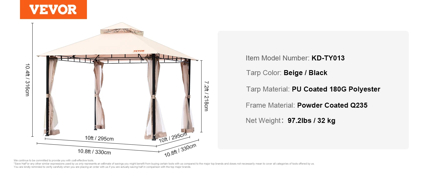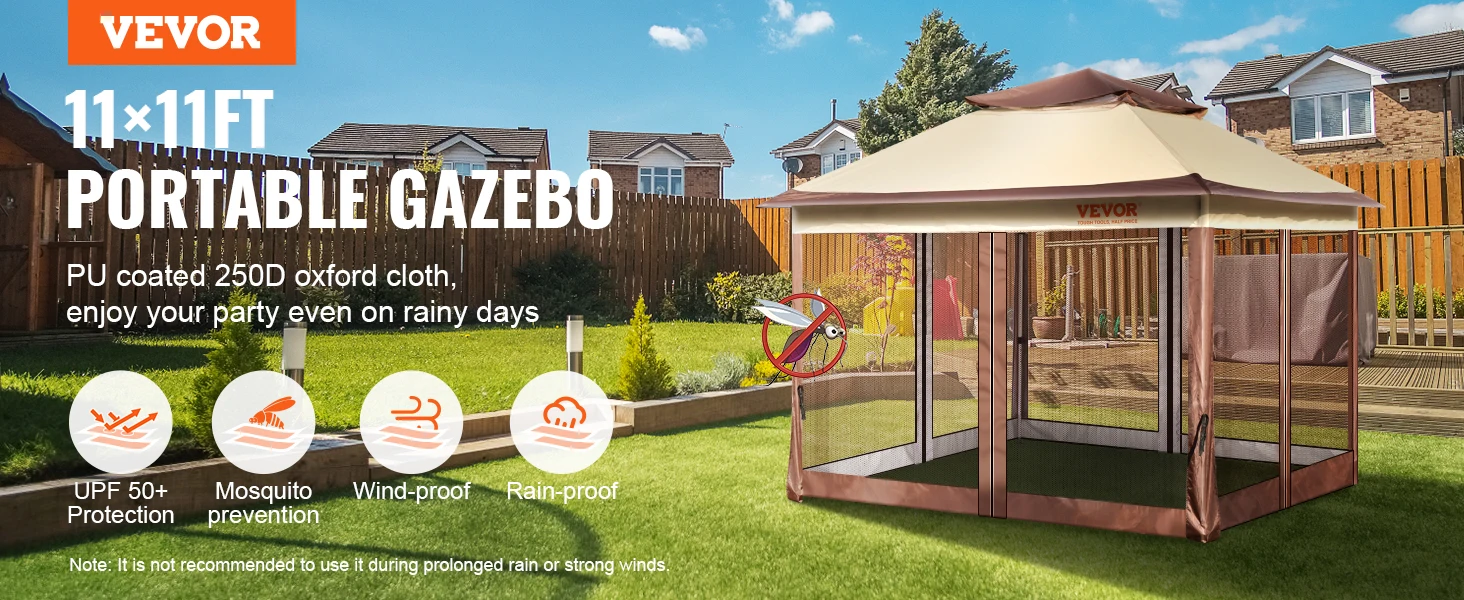 Sei pronto per la festa?Esperienza all’aperto con comfort e stile utilizzando il nostro gazebo durevole e affidabile.Realizzato in tessuto Oxford 250D con rivestimento in PU, il gazebo da patio VEVOR offre protezione UPF 50+, resistenza al vento e alla pioggia e efficace controllo degli insetti.