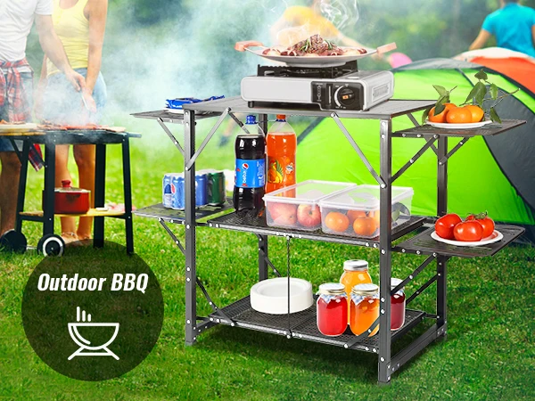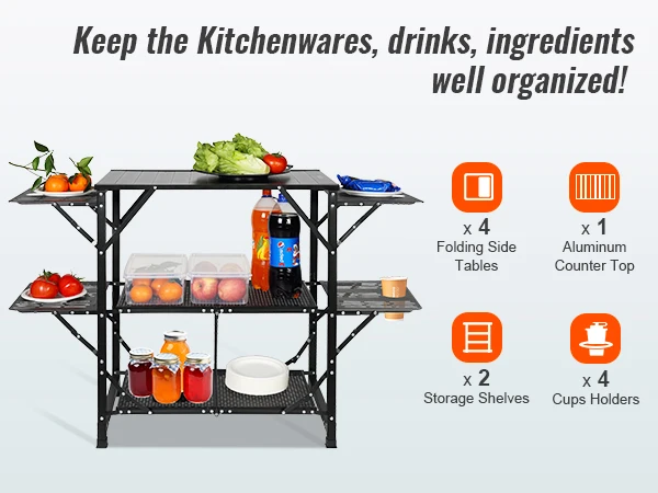 Grande gestione dello spazio: il nostro tavolo da cucina da campeggio è progettato per prendere la cucina all’esterno!Puoi organizzare le tue stufe, le griglie e gli pentole in modo ordinato sul piano in alluminio, 4 tavolini pieghevoli e ripiano portaoggetti.Plus, i portabicchieri mantengerà le tue tazze e le bottiglie nel posto e impediscono di cadere.