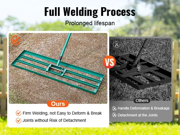Saldatura Artigianale Rinforzata: l’utilizzo di una saldatura completa tra la piastra di base e il manicotto invece della saldatura a punti garantisce che la livellatrice per prato possa gestire lavori più pesanti. Poiché la maniglia è incredibilmente robusta e durevole, non dovrai preoccuparti che si rompa, si allenti o si allenti.
