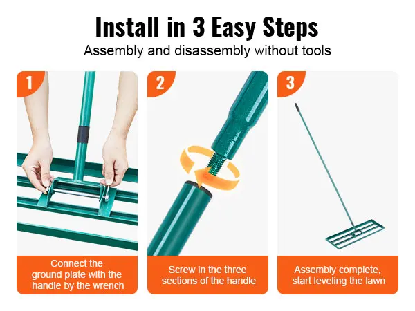Facile Installazione & Conservazione: il design avvitato a 3 sezioni semplifica il montaggio e lo smontaggio. Allineare le filettature della maniglia, avvitare e serrare. Dopo lo smontaggio, il nostro rastrello livellatore diventa compatto per lo stoccaggio. La robusta struttura avvitata garantisce durata nell’uso.