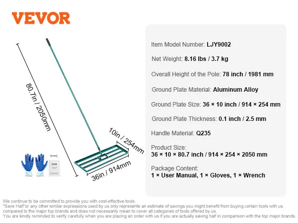 Rastrello Livellatore per Prato: strumento di livellamento VEVOR con piastra di base da 914×254 mm, livella il terreno in modo rapido ed efficiente, risparmiando tempo e fatica. Adatto a vari terreni come prati, campi, giardini e campi da golf per livellare sabbia, terreno, compost e muschio.