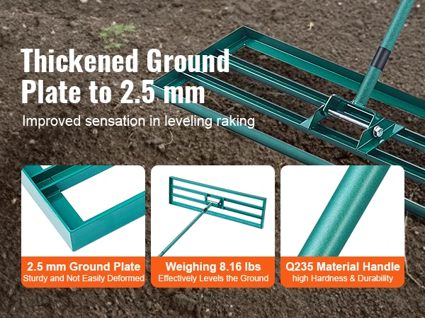Lo strumento di livellamento ti consente di livellare ampie aree spostando avanti e indietro la piastra di base da 914×254 mm. Copre più terreno, levigando le superfici del prato. Adatto per livellare la sabbia, appiattire il terreno, livellare il compost e lisciare il muschio.