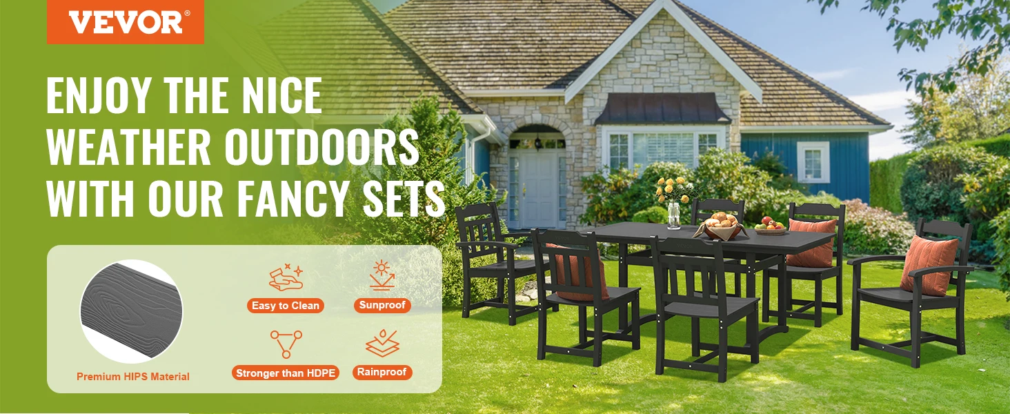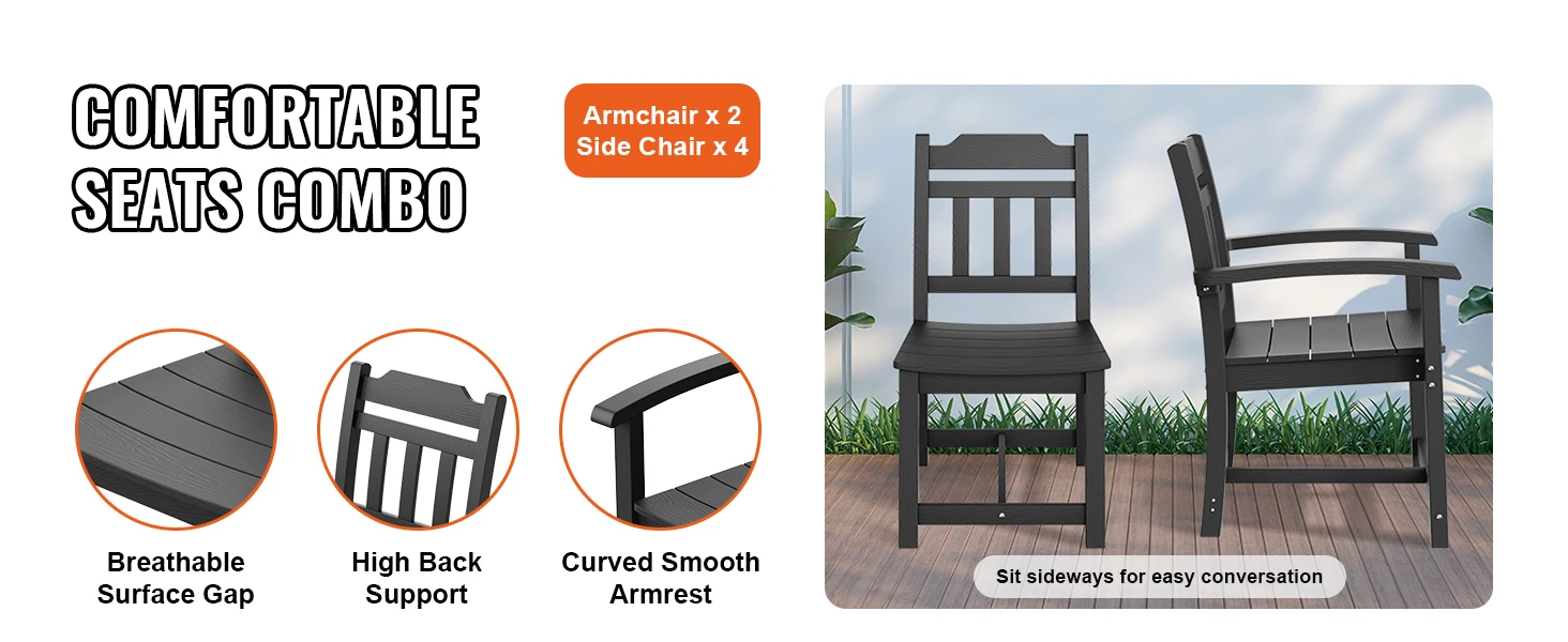 Il tavolo presenta una goffratura più profonda che migliora la trama, dona un aspetto di prima scelta.Il piano da tavolo simile al legno aggiunge un tocco di eleganza al tuo spazio da pranzo all’aperto.