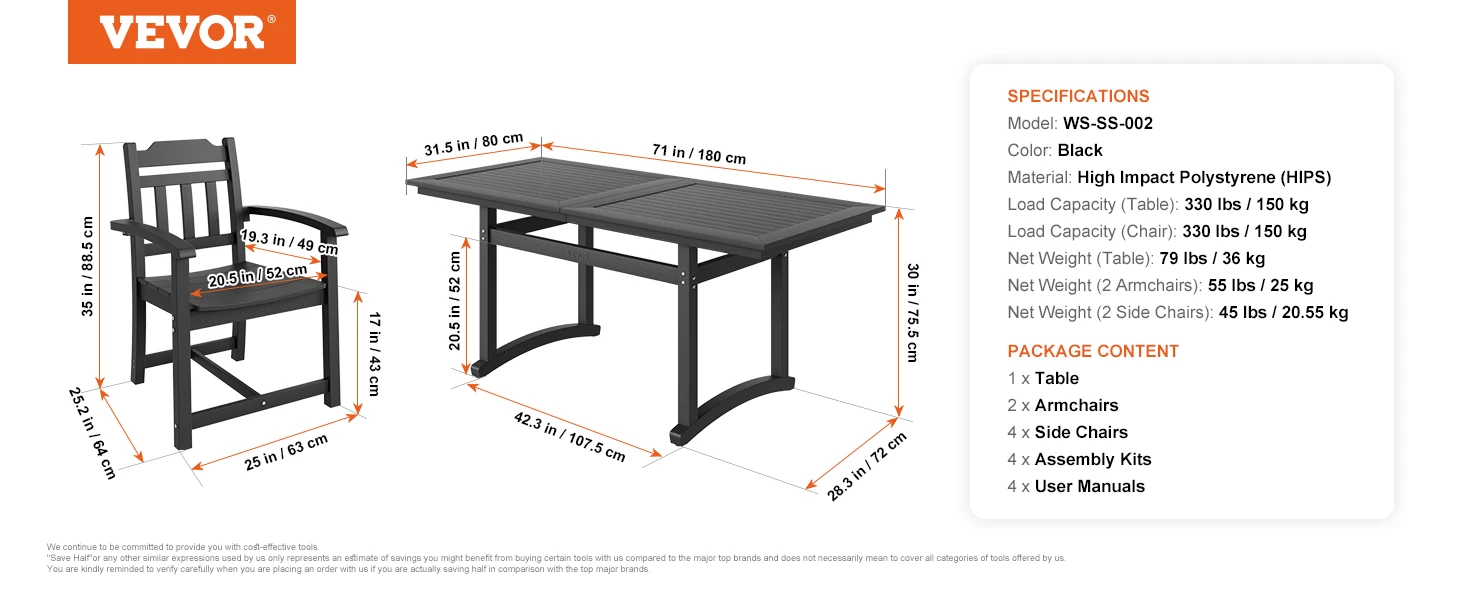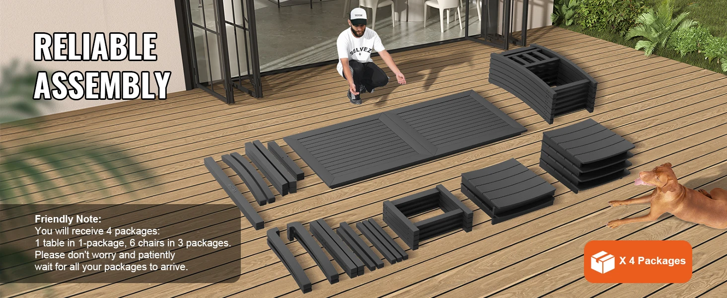 Goditi l’assemblaggio semplice: assemblare l’area pranzo all’aperto del tuo sogno è mai stato più facile. Prendiamo la cura della logistica, dividere l’impostato in 4 confezioni per la tua comodità (1 tavolo in 1 confezione, 6 sedie in 3 pacchi), garantisce un processo di assemblaggio senza problemi e direttamente.