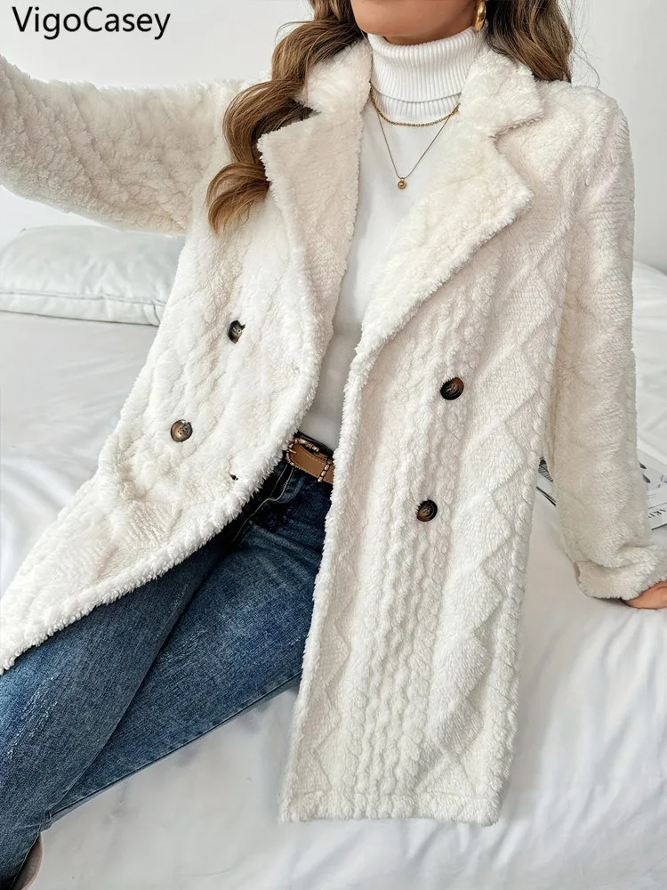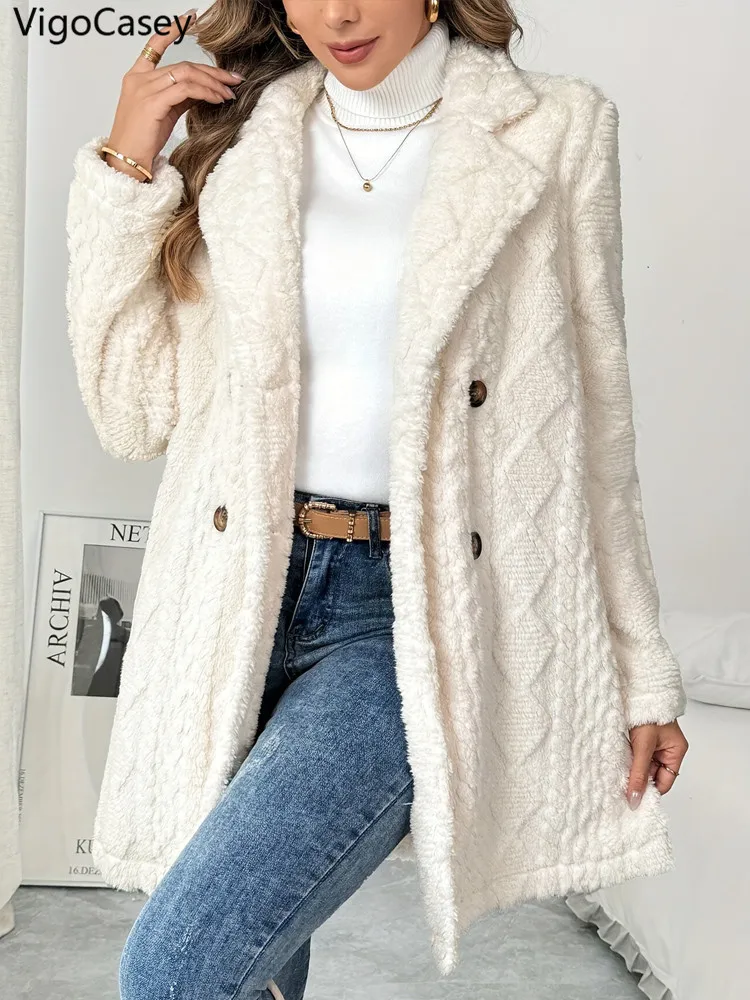 VigoCasey 2025 Autunno Inverno Donna Giacca casual Cappotto caldo in peluche spesso bianco Manica lunga Cardigan morbido Cappotto monopetto da donna