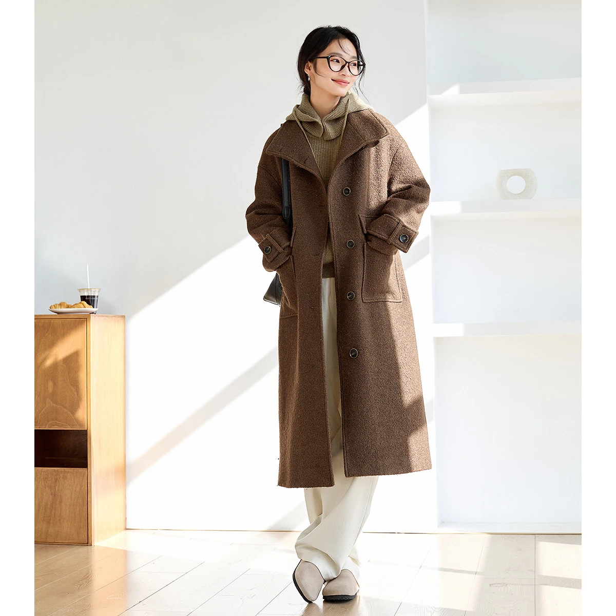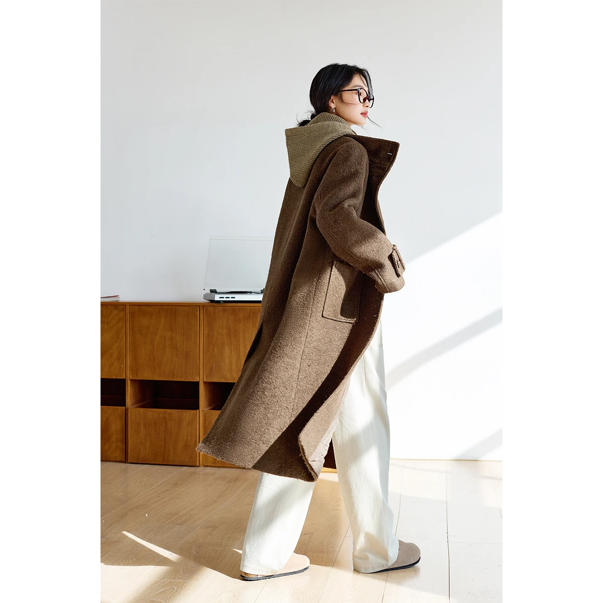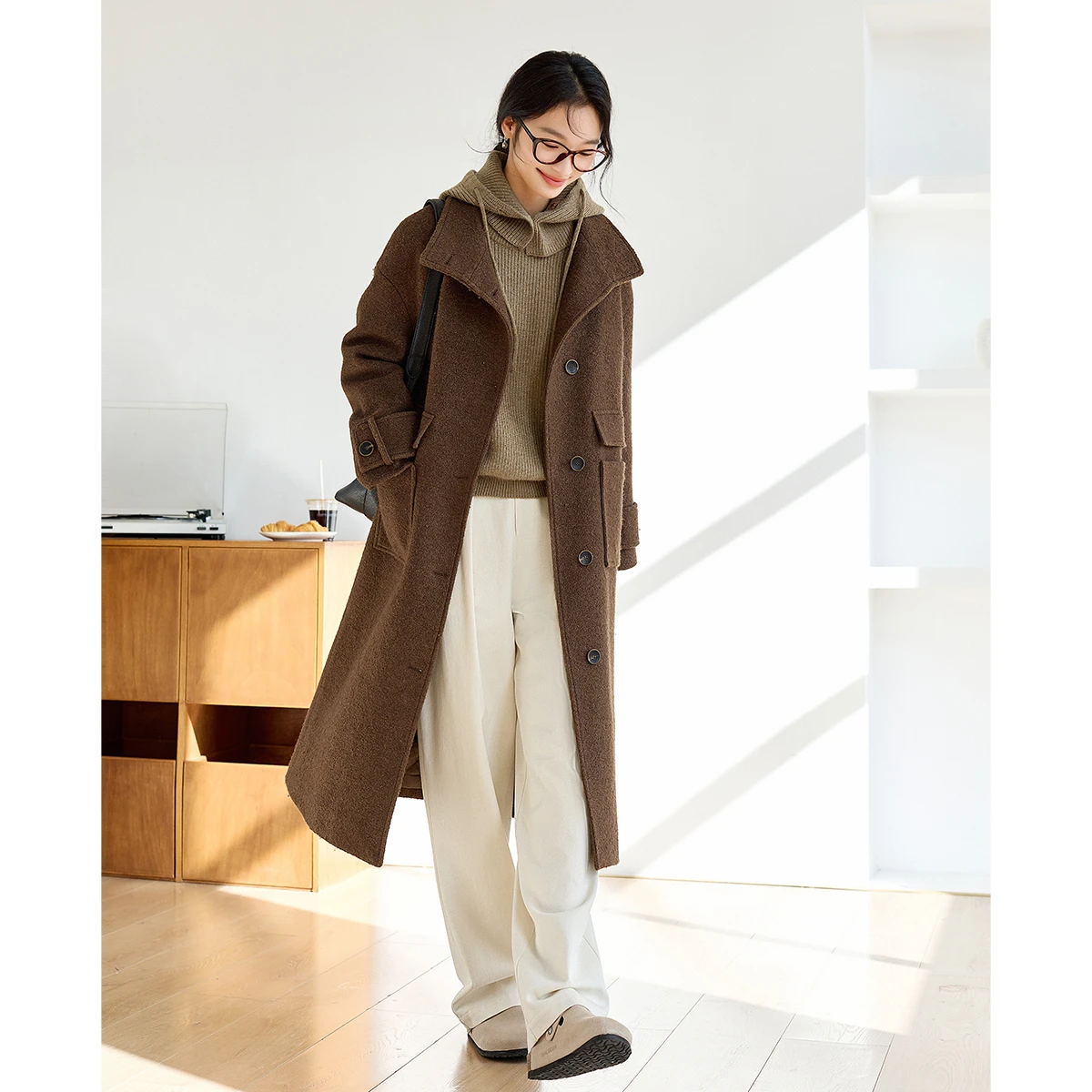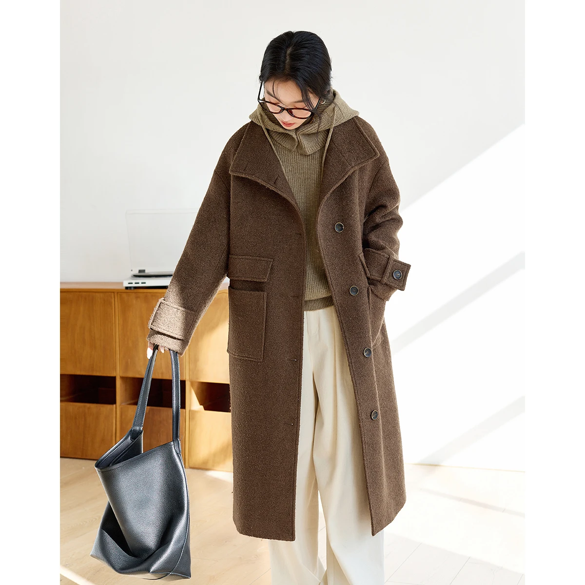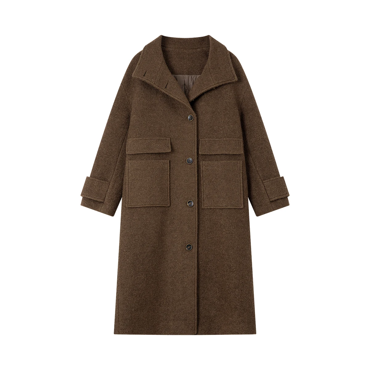 VIMLY Donna Inverno Marrone Cappotti Lunghi 2025 Abbigliamento da Ufficio Stand Collo Cappotti di Lana Vintage Allentato Trapuntato Tweed Cappotto Femminile M9289