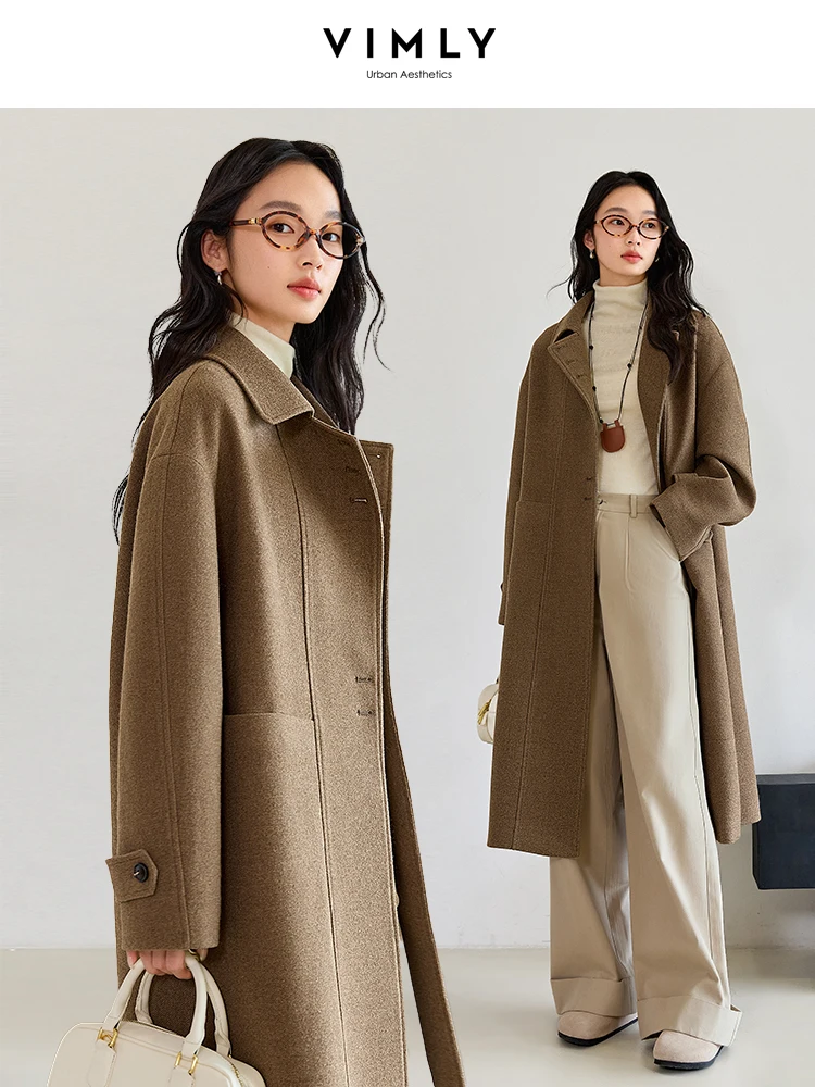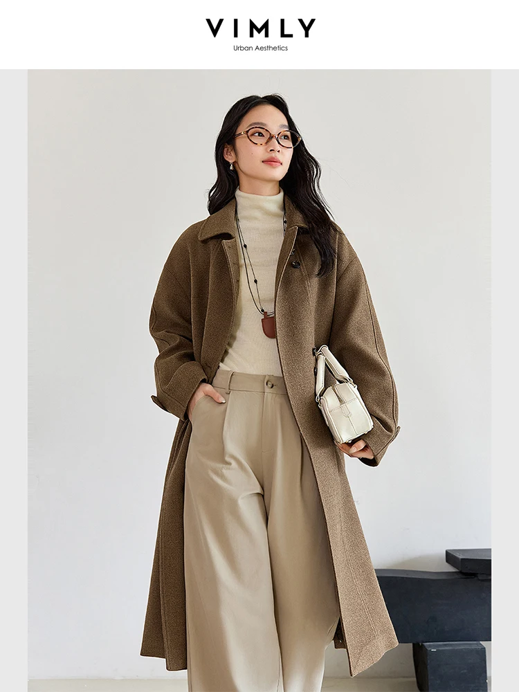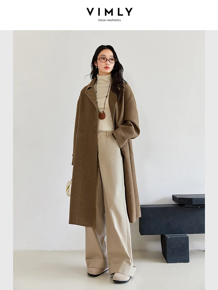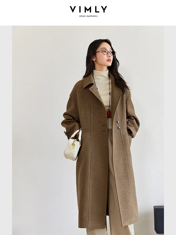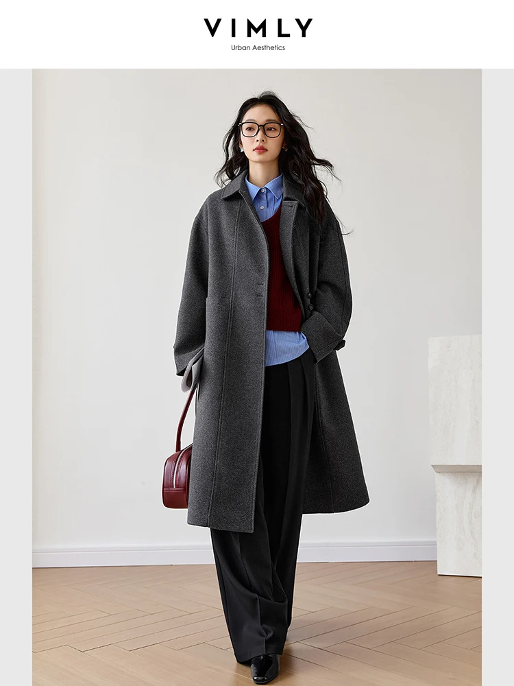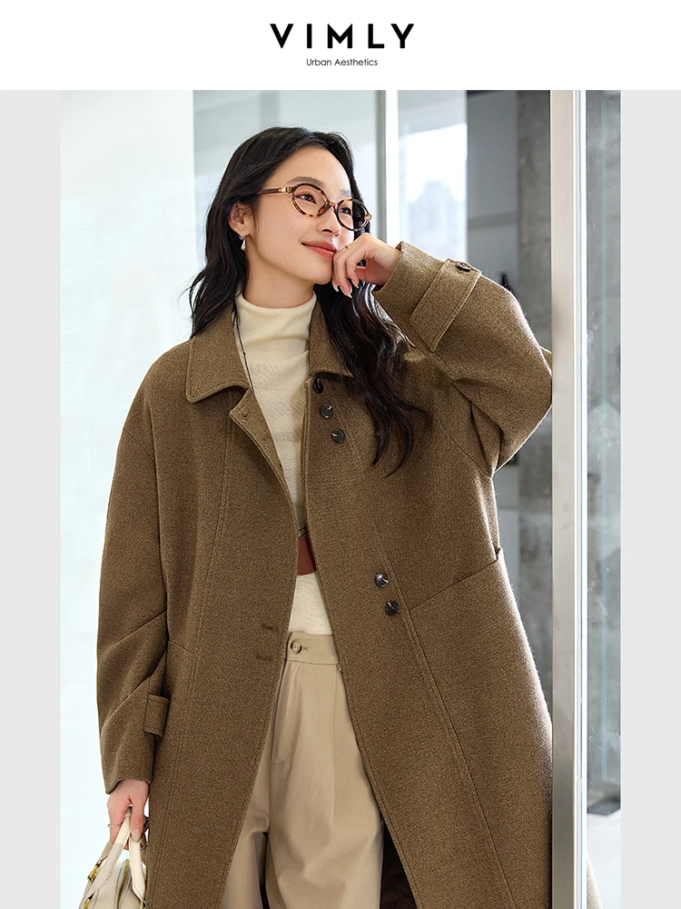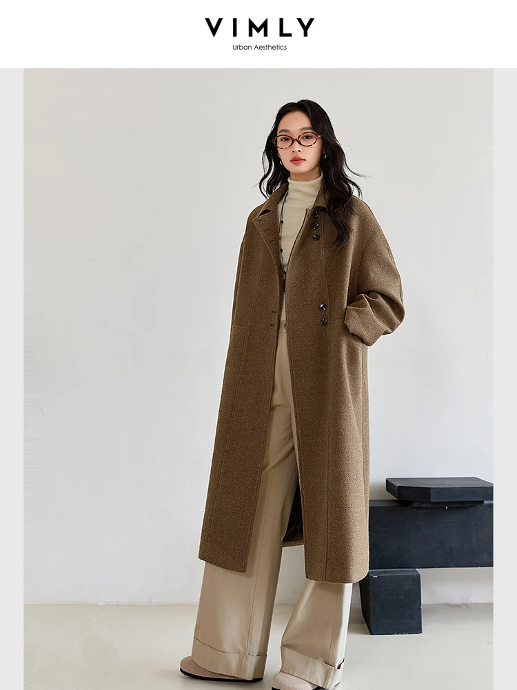 VIMLY Donna Streetwear Cappotto lungo di lana Inverno 2025 Office Lady Giacche con risvolto Elegante semplice soprabito Capispalla spesso M9951