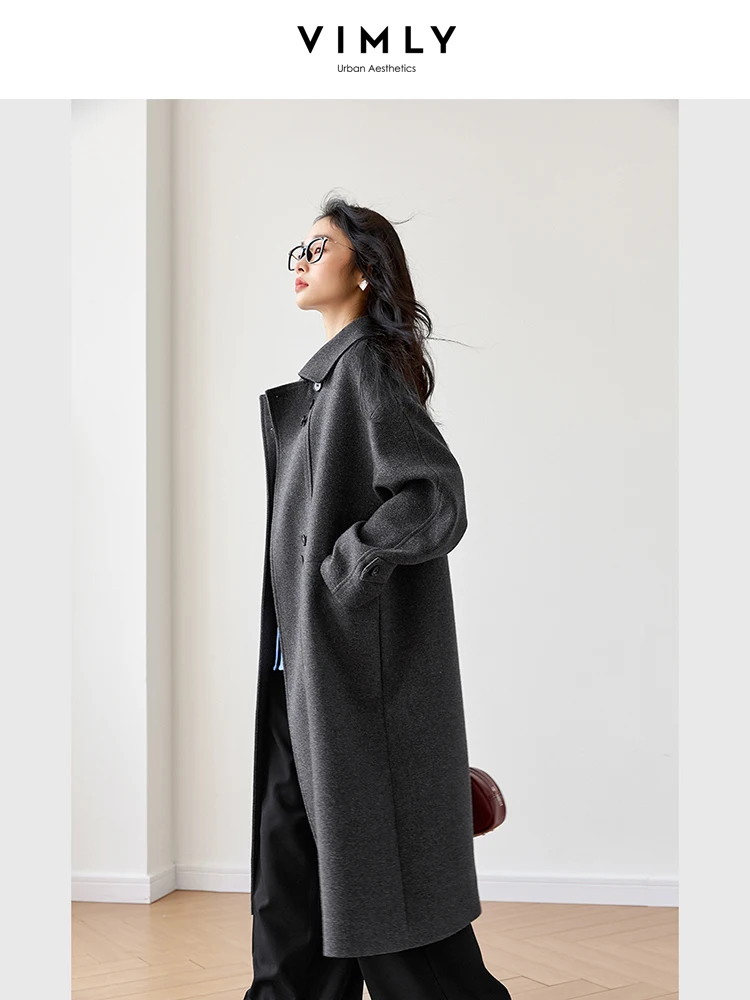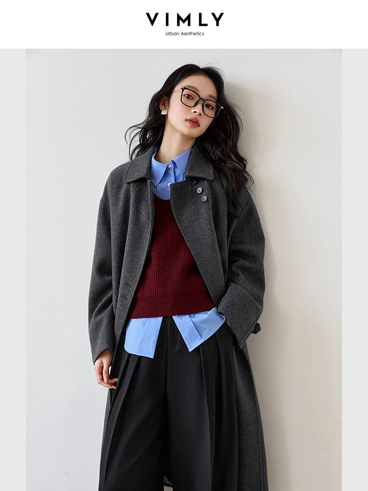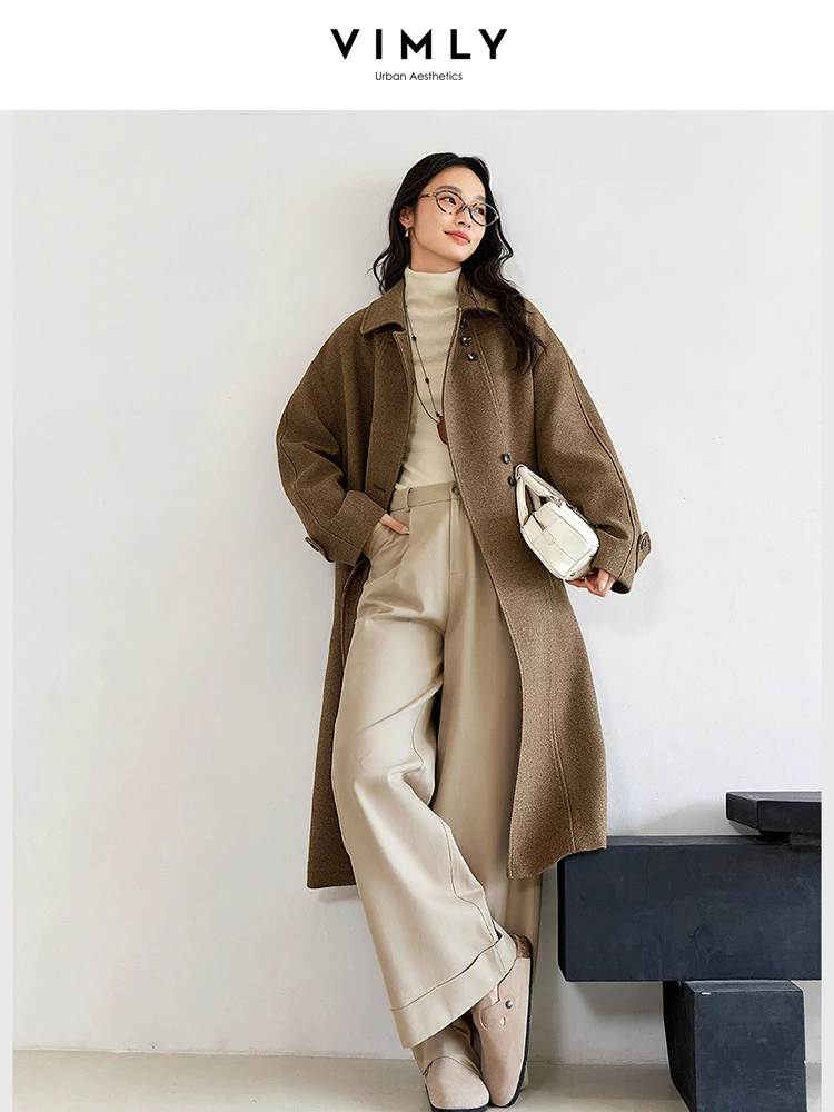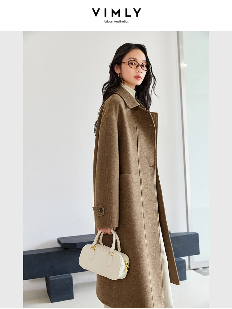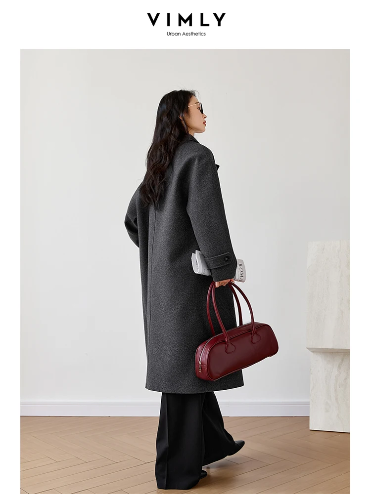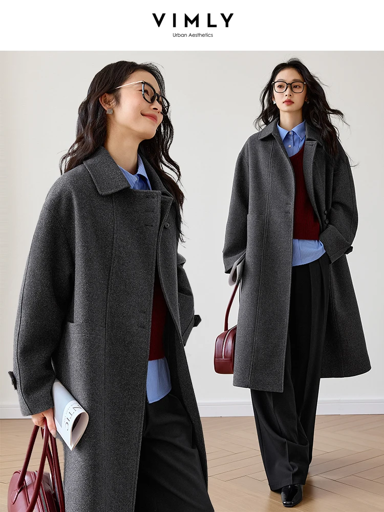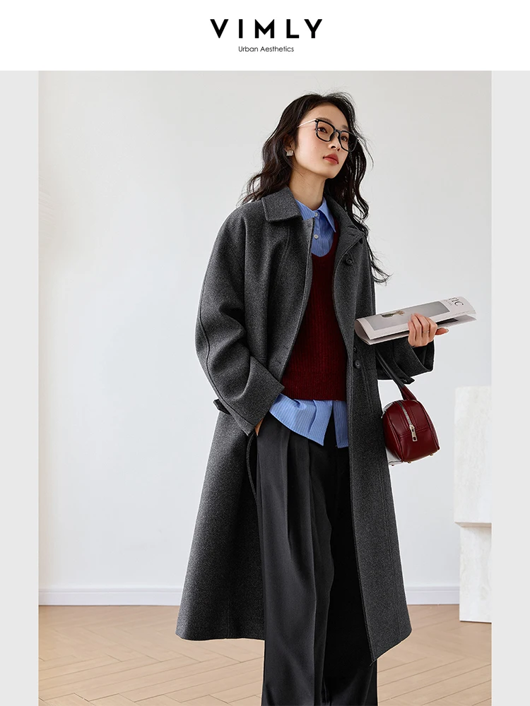 VIMLY Donna Streetwear Cappotto lungo di lana Inverno 2025 Office Lady Giacche con risvolto Elegante semplice soprabito Capispalla spesso M9951