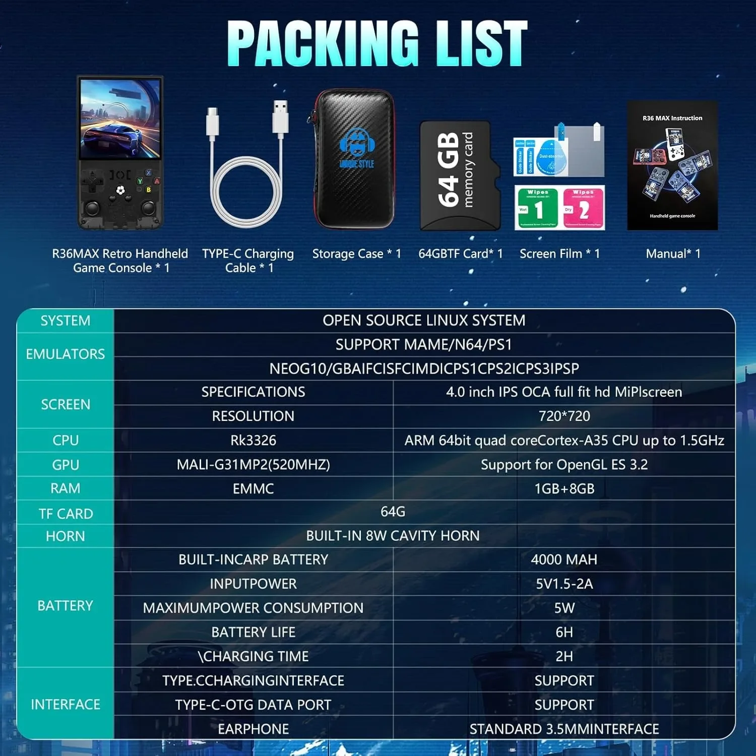 Caratteristica della console di gioco portatile R36MAX