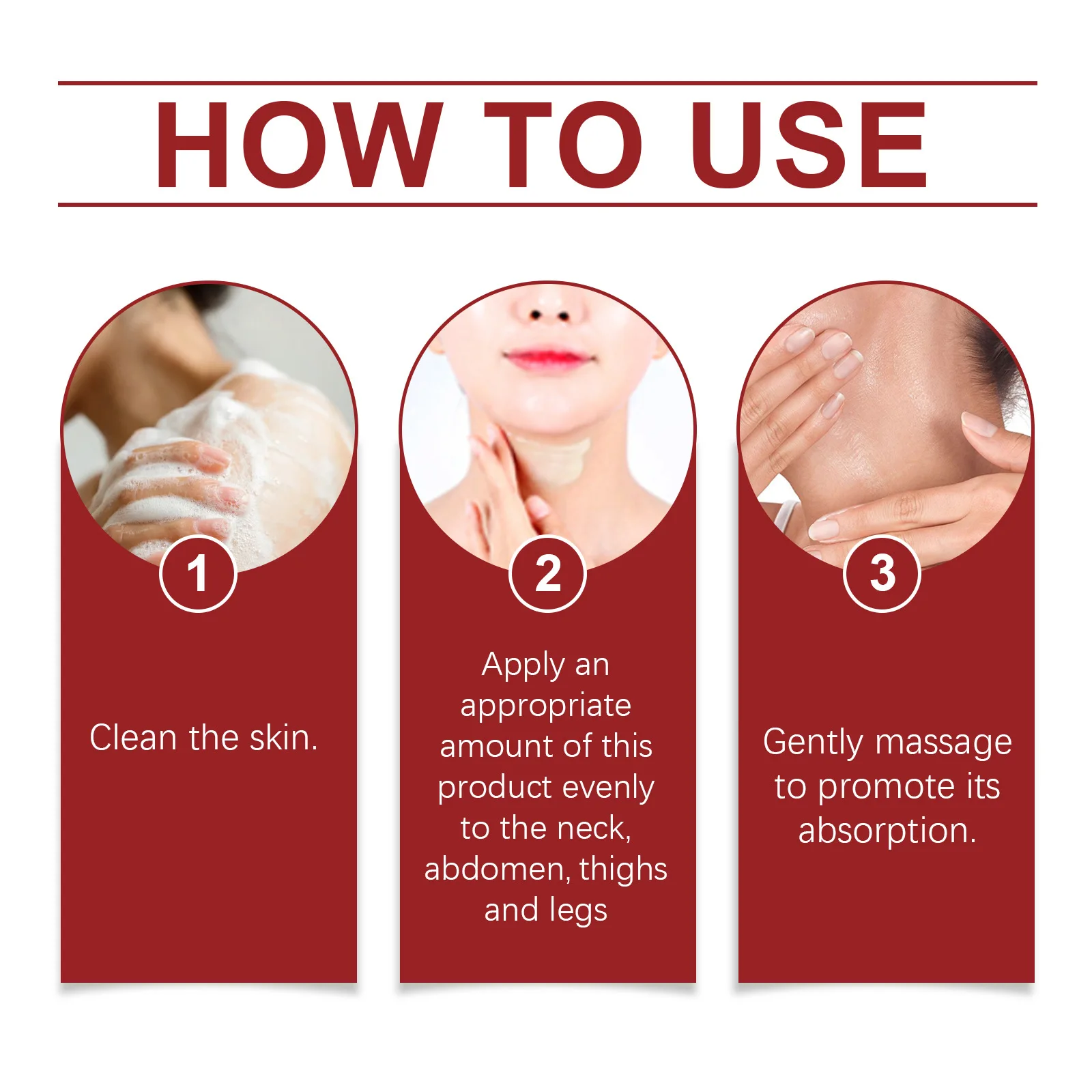 2.Applicare una quantità appropriata di questo prodotto uniformemente al collo, dell’addome, delle cosce e delle gambe.