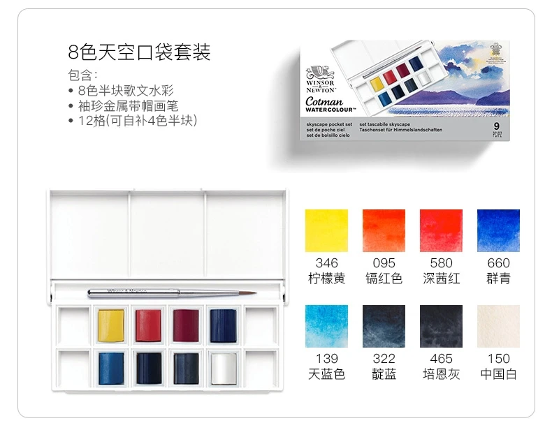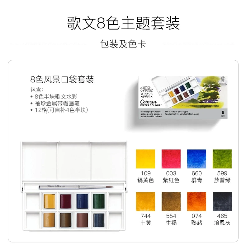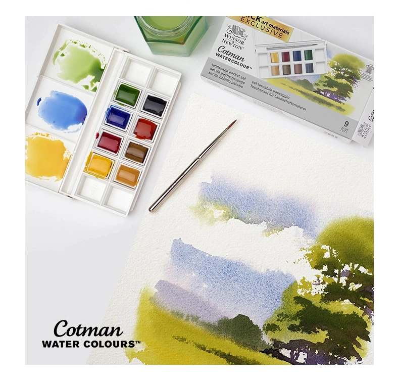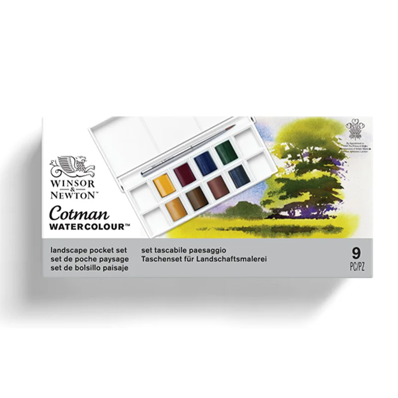 Set Contenuto: 1 x Pennello da viaggio, 8 mezze padelle Cotman: Cadmium Yellow Hue, Alizarin Crimson Hue, Ultramarina, Verde Sap, Ocra gialla, Umber cruda, Sienna bruciata, Grigio di Payne.I contenuti effettivi possono variare.