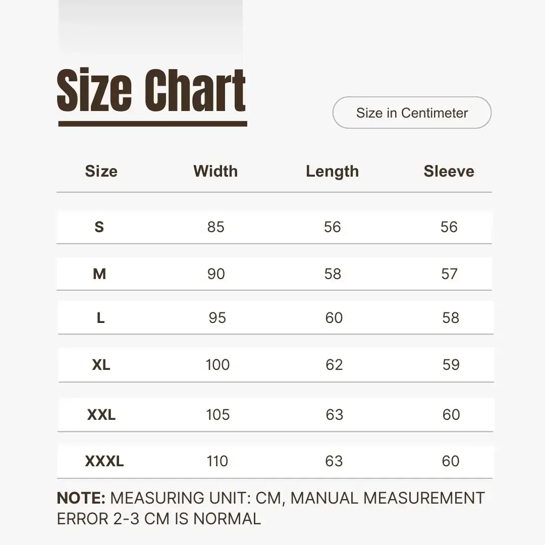 S: lunghezza 56cm, busto 85cm, manica 56cm M: lunghezza 58cm, busto 90cm, manica 57cm L: lunghezza 60cm, busto 95cm, manica 58cm XL: lunghezza 62cm, busto 100cm, manica 59cm, XXL: lunghezza 63cm, busto 105cm, manica 60cm XXXL: lunghezza 63cm, busto 110cm, manica 60cm Questa è la dimensione dell’asia, 1cm = 0.394 pollici, 1 pollice = 2.54cm Nota: (1) misurazione manuale, ci può essere un errore di 1-2 cm, grazie per la tua conoscenza. (2) a causa di diversi display e diversi lotti di prodotti, il colore dell’immagine reale può essere leggermente diverso. Grazie per la tua intelligenza.