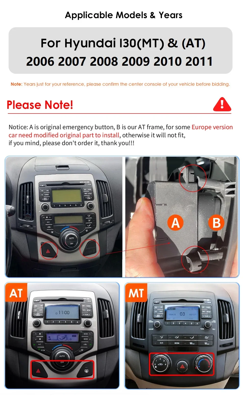 Modelli e anni applicabiliper centoai I30 2006 2007 2008 2009 2010 2011 AT & MTNota:1.A è il pulsante di emergenza originale,B è un telaio AT, che per alcune versioni europee necessita di una parte originale modificata per l’installazione e quindi può adattarsi bene, come l’immagine seguente mostra i dettagli,se ti dispiace, non ordinarlo, grazie per averlo notato prima di fare un’offerta.2. abbiamo AT (versione automatica) e MT (versione manuale), scegli quella corretta per la tua auto prima di effettuare l’ordine.3.Elenco compatibile solo per riferimento, si prega di confermare la forma e le dimensioni della console certer prima di fare offerte, se le dimensioni non sono le stesse, non ordinarle per evitare ordini errati.Nota:questo elenco mostra ilSerie SᅠModelloᅠ,L’immagine dell’altro articolo non è mostrata in questo elenco di descrizione, ma puoi controllare i dettagli seguendo la prima immagine per le sue funzioni, scegli il modello che ti serve prima di fare offerte.