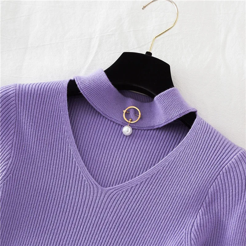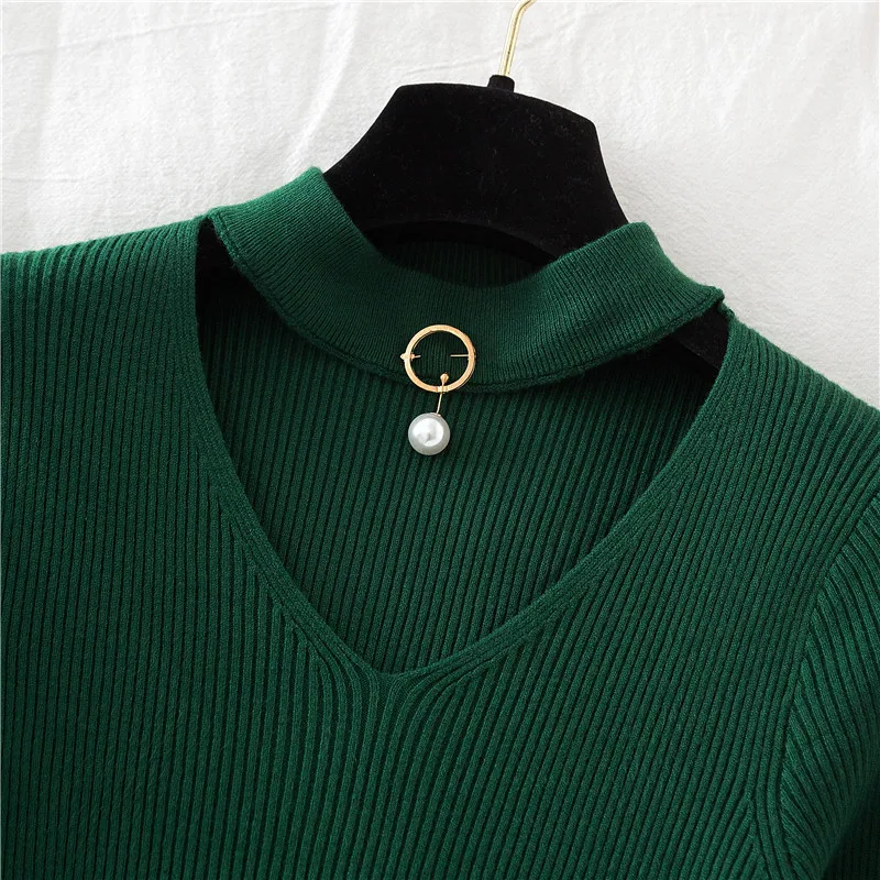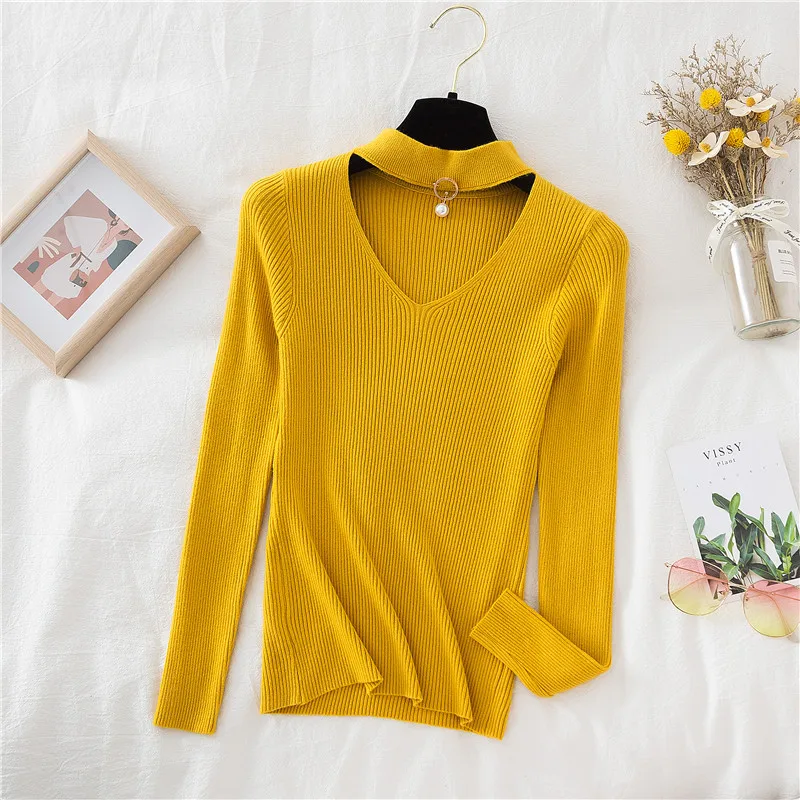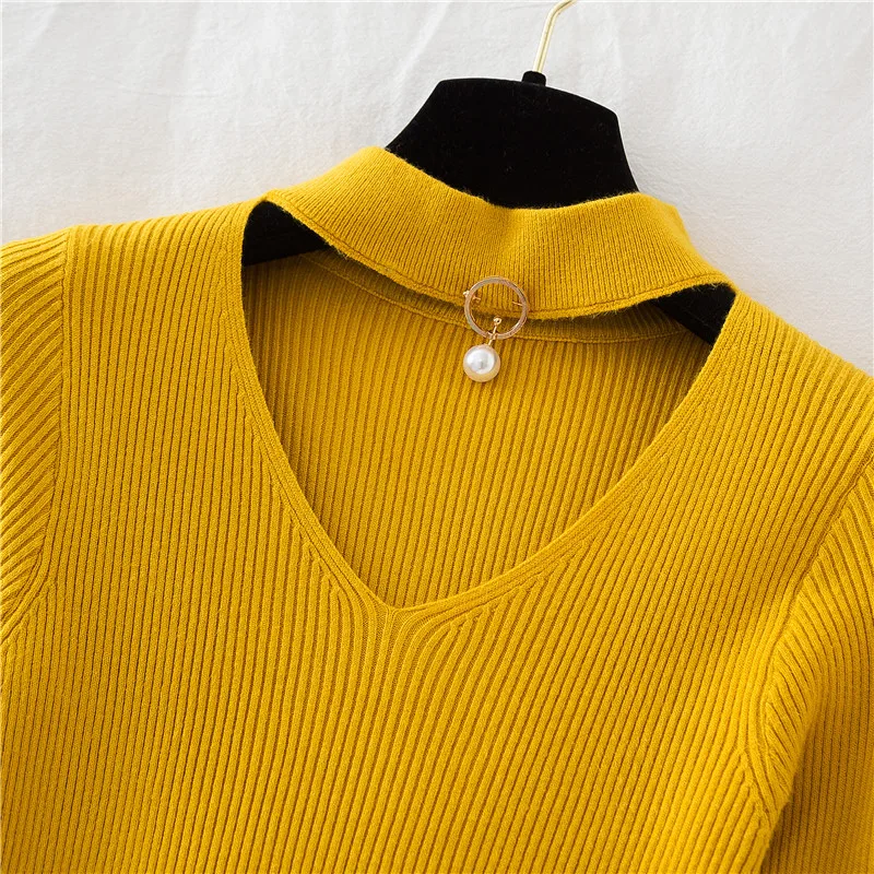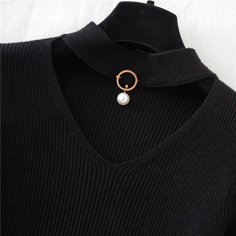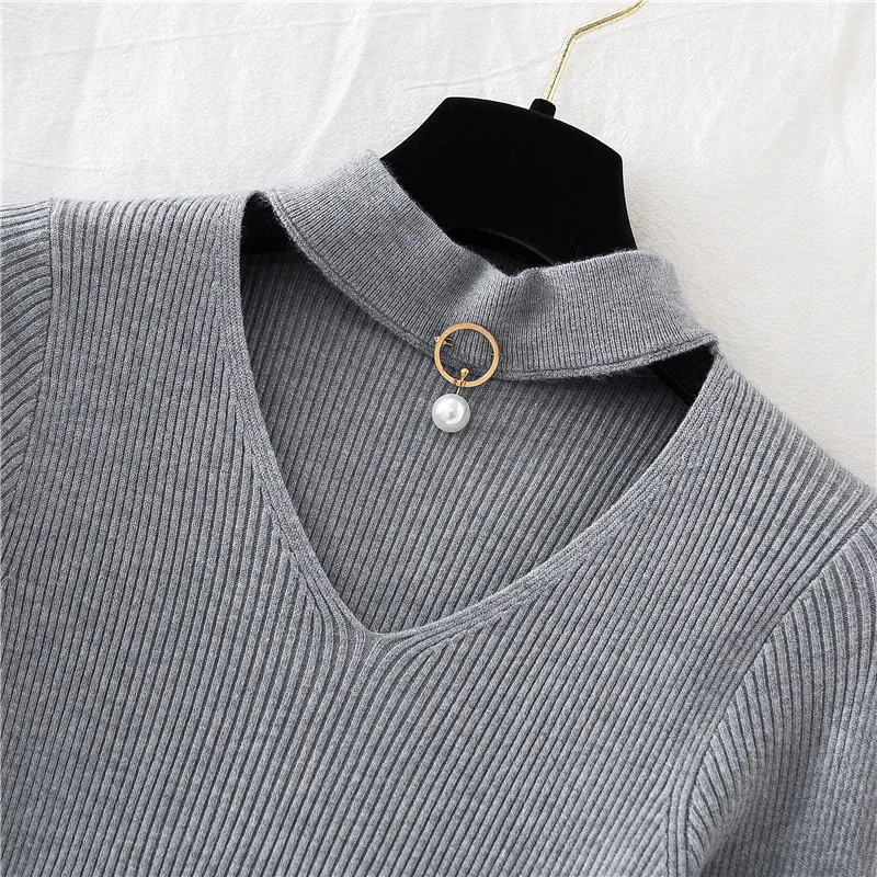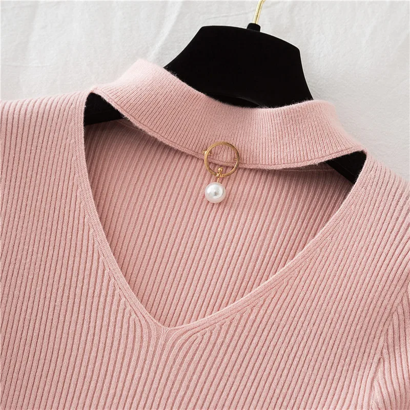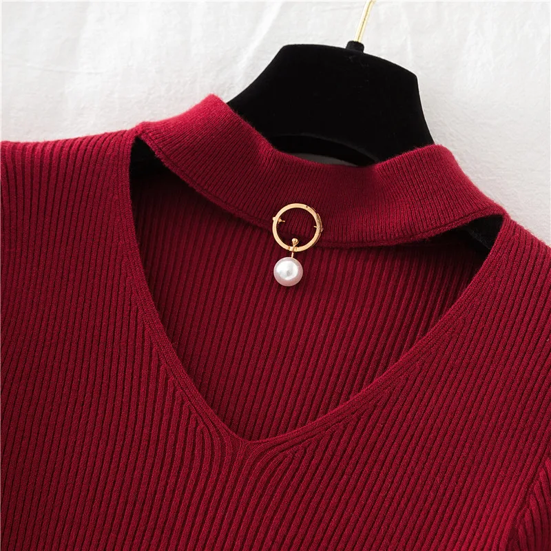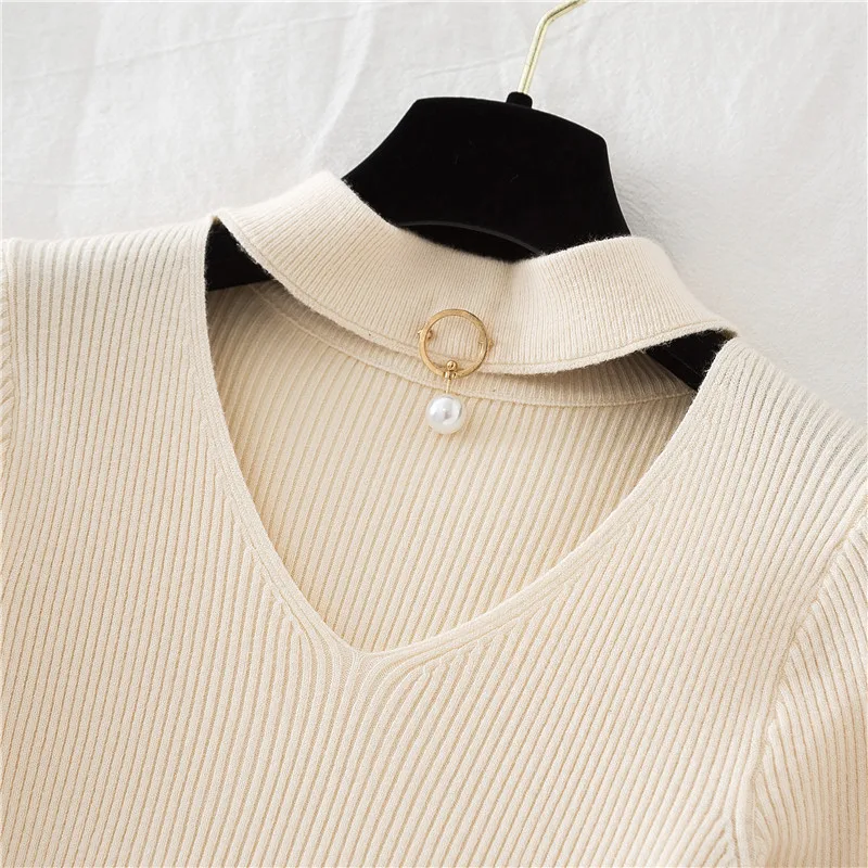 Woherb Maglione da donna Sottile Pullover femminile allentato Corto scollo a V Scava fuori Maglia con coulisse Manica a tre quarti Top corto da donna