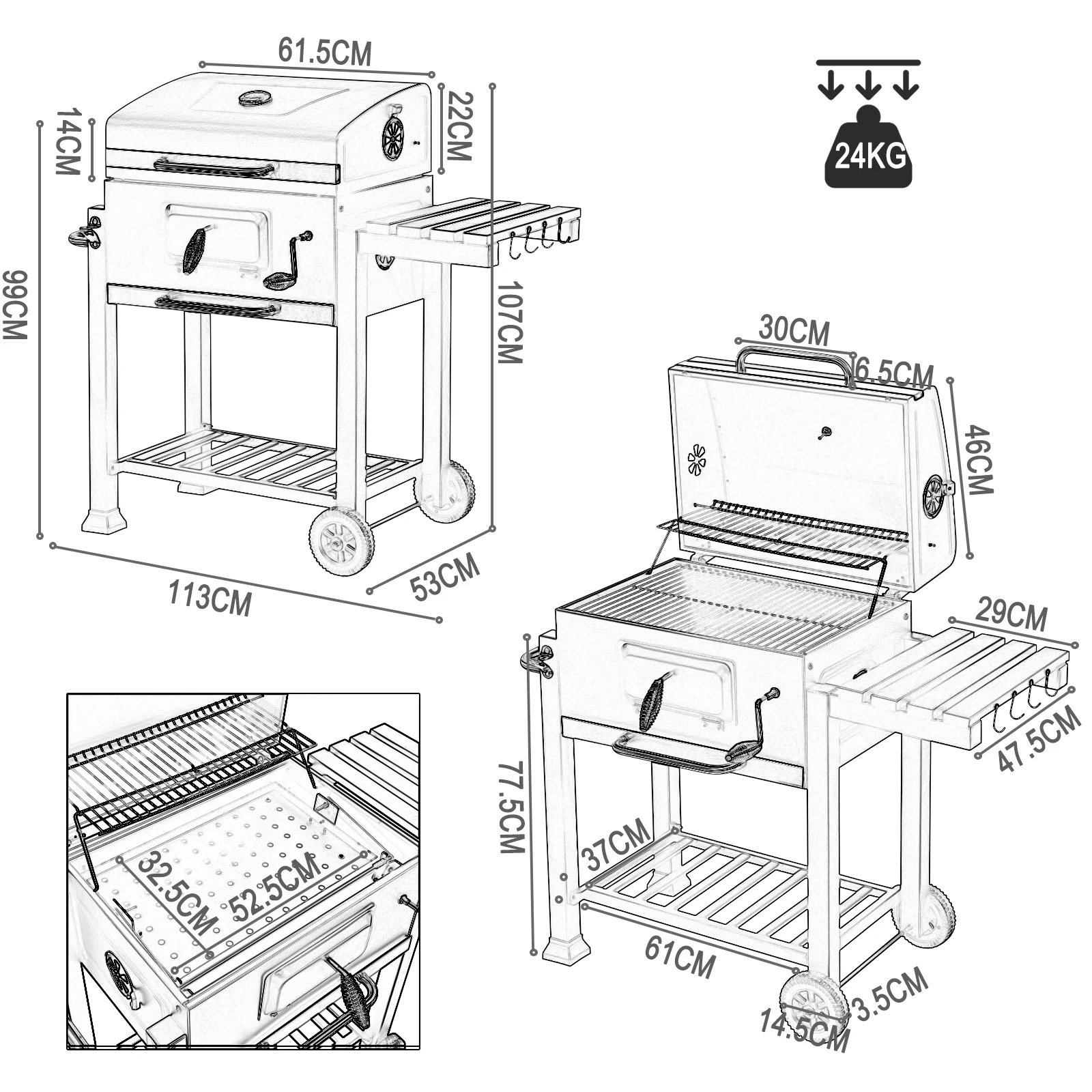 [Griglia a carbone regolabile in altezza]-l’altezza della griglia a carbone può essere facilmente regolata utilizzando una manovella in modo da determinare la temperatura della griglia richiesta da soli.