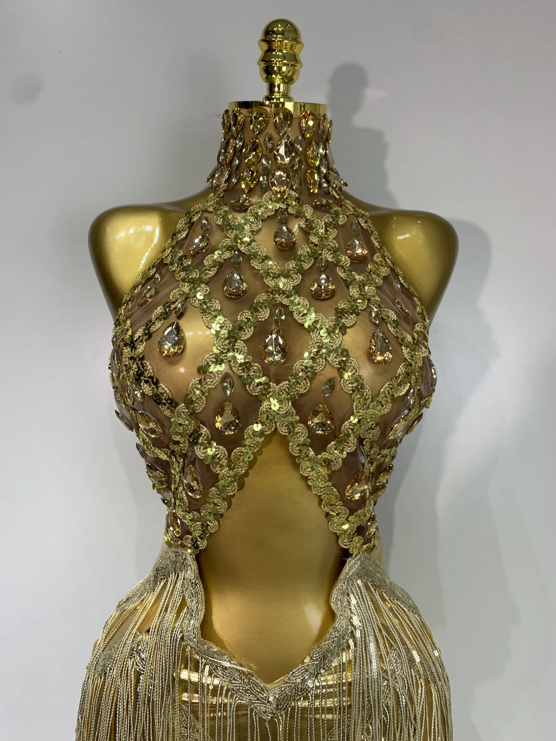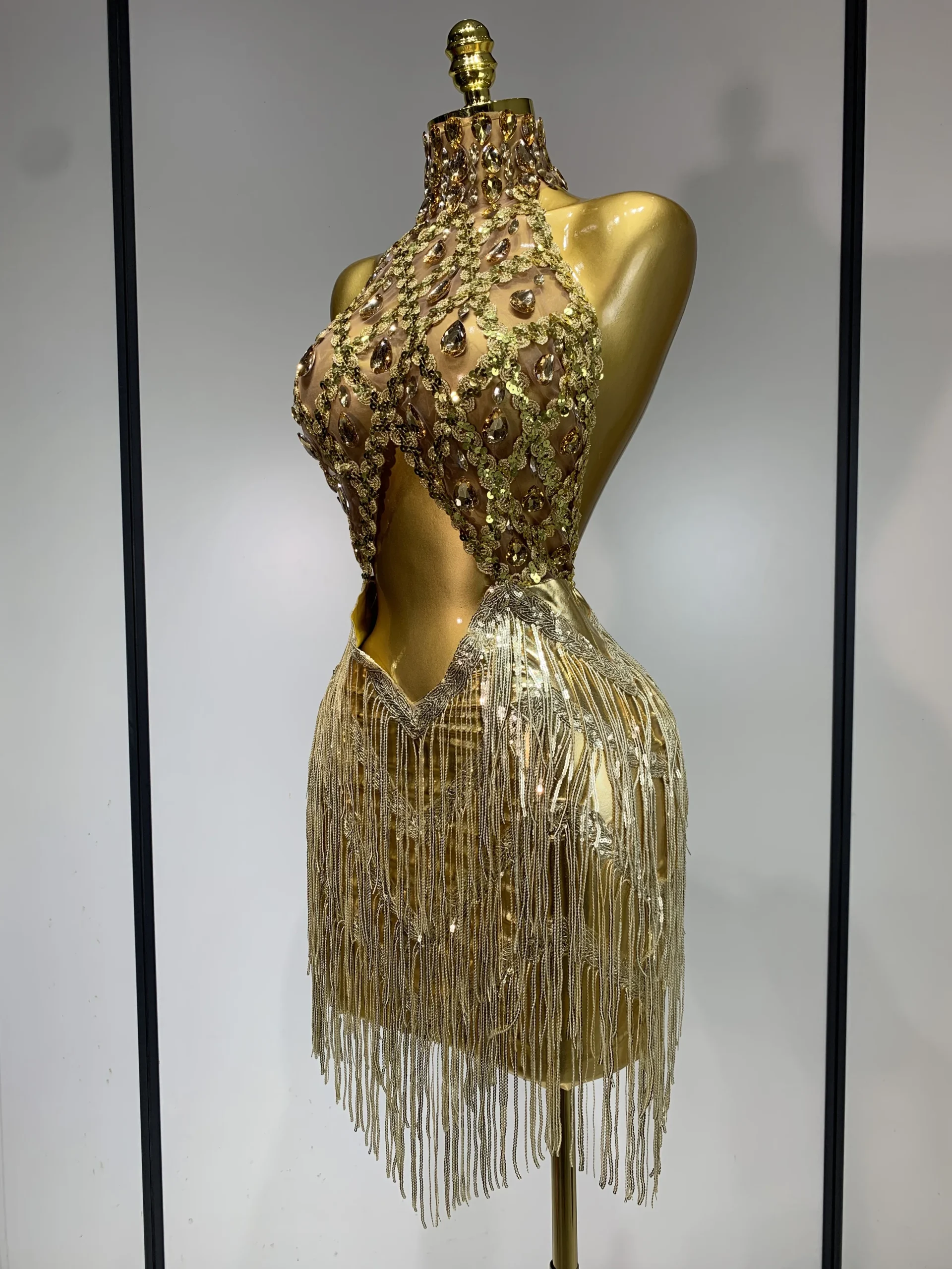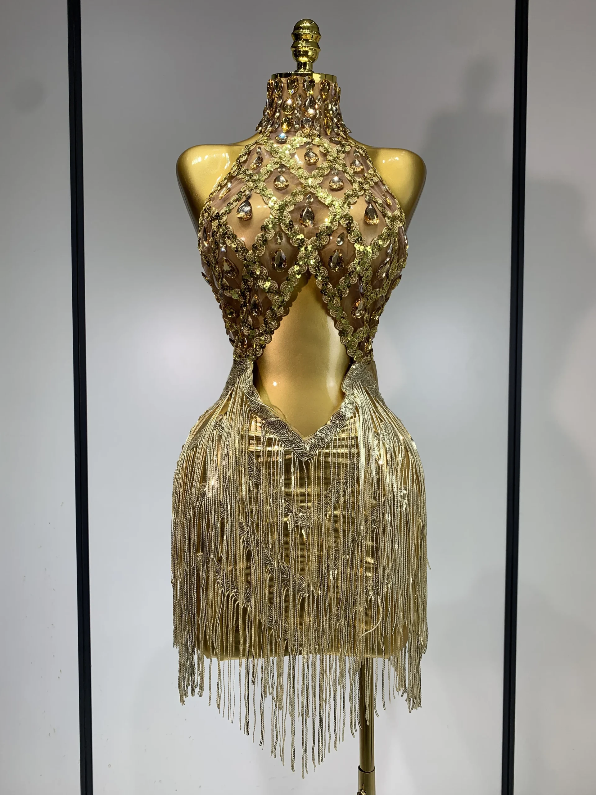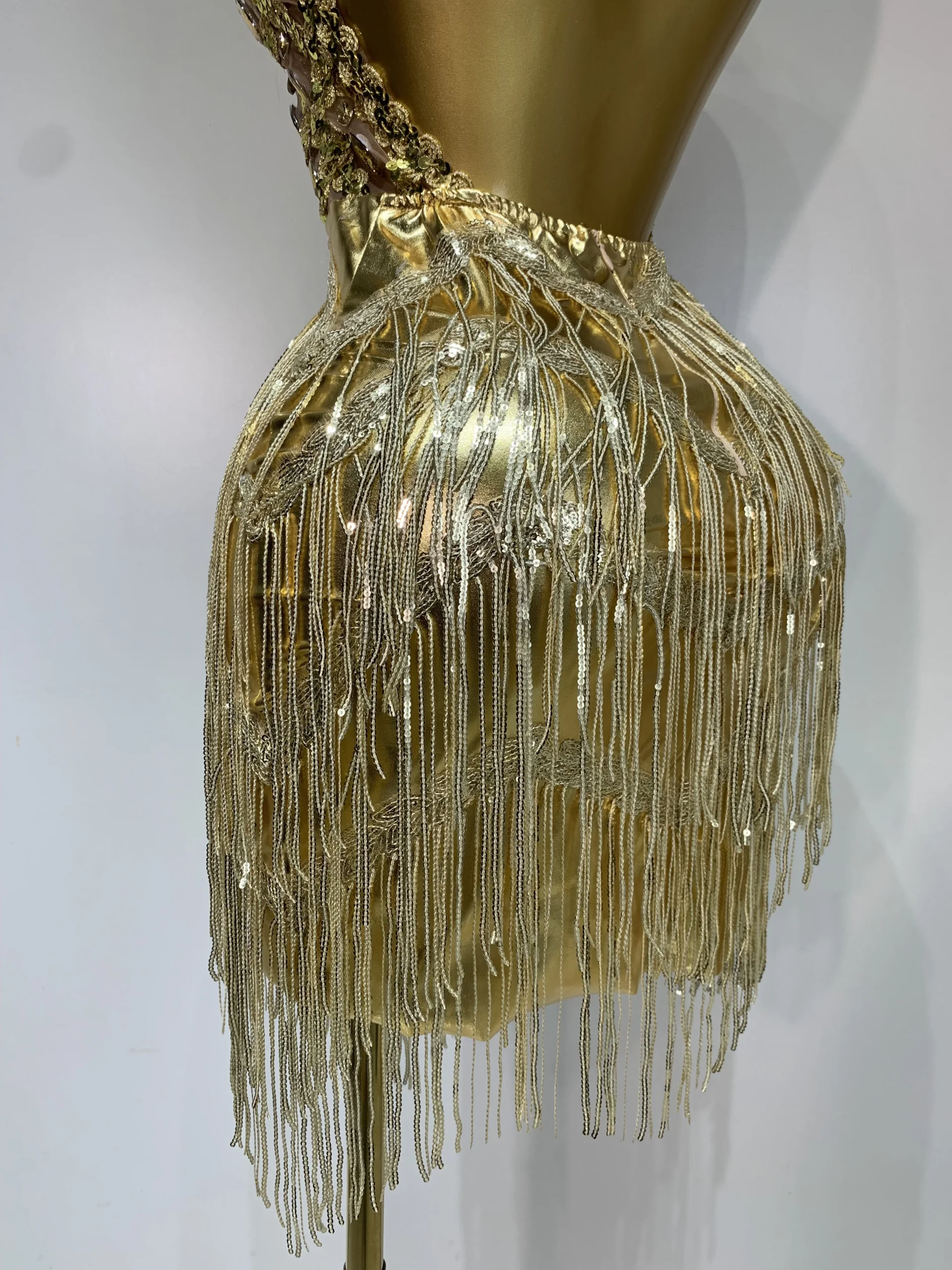 Women Birthday Party Rhinestones Tassels Transparent Short Dress Dance Show 2025 New Sexy Fashion Gold Sparkly Stage Costume